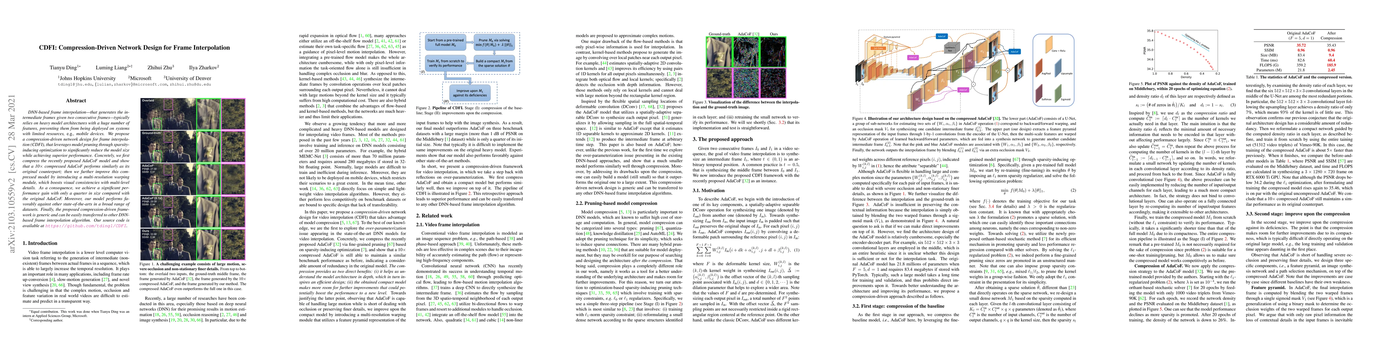 The paper proposes a compression-driven network design (CDFI) for DNN-based frame interpolation, achieving significant model size reduction through sparsity-inducing optimization and multi-resolution warping. The compressed model maintains performance while being a quarter the size of the original, outperforming other state-of-the-art methods.