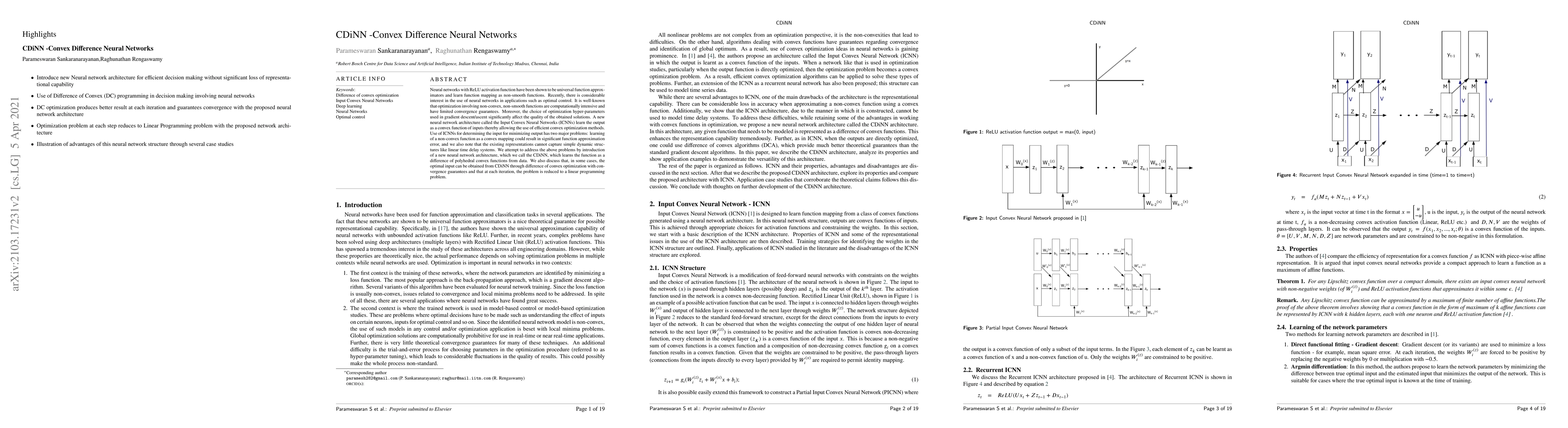 Neural networks with ReLU activation function have been shown to be universal function approximators and learn function mapping as non-smooth functions. Recently, there is considerable interest in the use of neural networks in applications such as optimal control. It is well-known that optimization involving non-convex, non-smooth functions are computationally intensive and have limited convergence guarantees. Moreover, the choice of optimization hyper-parameters used in gradient descent/ascent significantly affect the quality of the obtained solutions. A new neural network architecture called the Input Convex Neural Networks (ICNNs) learn the output as a convex function of inputs thereby allowing the use of efficient convex optimization methods. Use of ICNNs for determining the input for minimizing output has two major problems: learning of a non-convex function as a convex mapping could result in significant function approximation error, and we also note that the existing representations cannot capture simple dynamic structures like linear time delay systems. We attempt to address the above problems by introduction of a new neural network architecture, which we call the CDiNN, which learns the function as a difference of polyhedral convex functions from data. We also discuss that, in some cases, the optimal input can be obtained from CDiNN through difference of convex optimization with convergence guarantees and that at each iteration, the problem is reduced to a linear programming problem.