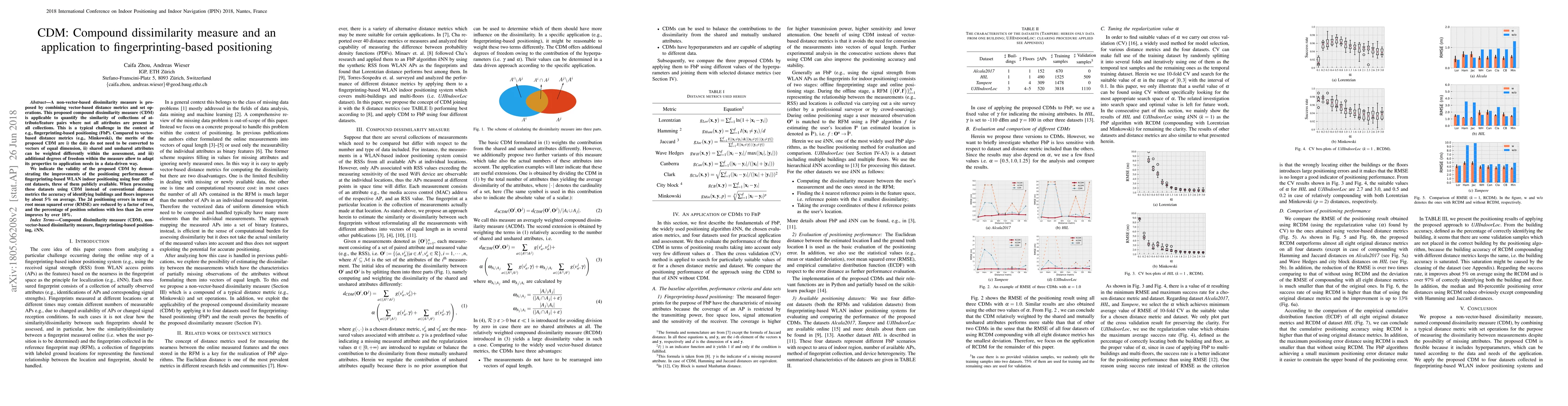 The paper proposes a compound dissimilarity measure (CDM) that combines vector-based distance metrics and set operations to quantify similarity in collections with varying attributes, applicable to fingerprinting-based positioning. CDM improves WLAN indoor positioning accuracy by about 5% and reduces positioning errors by a factor of two.