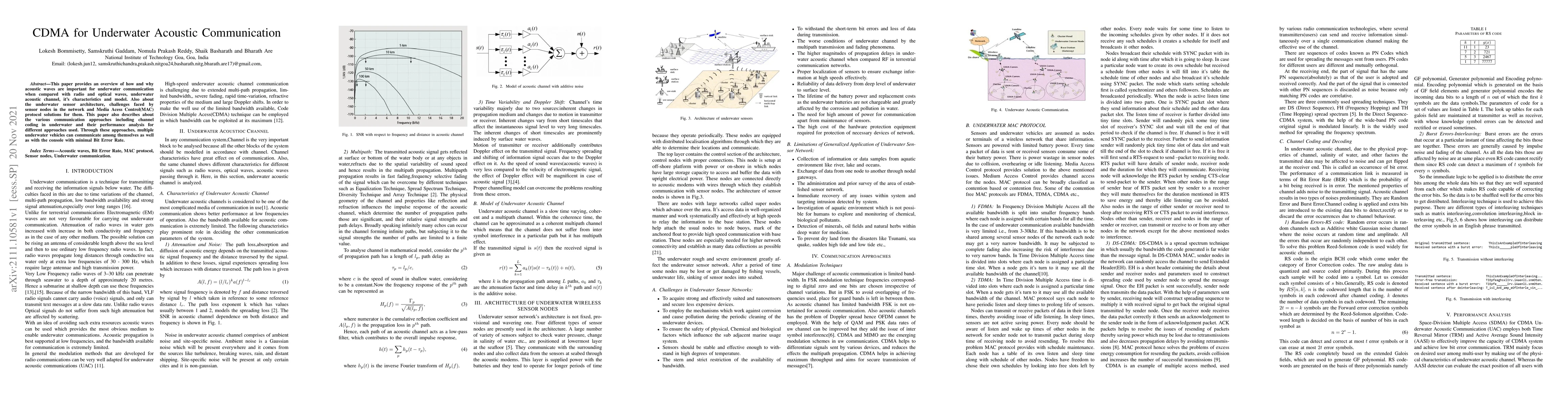 This paper explores the potential of CDMA for underwater acoustic communication, discussing its importance, channel characteristics, and various approaches to improve performance and minimize Bit Error Rate.