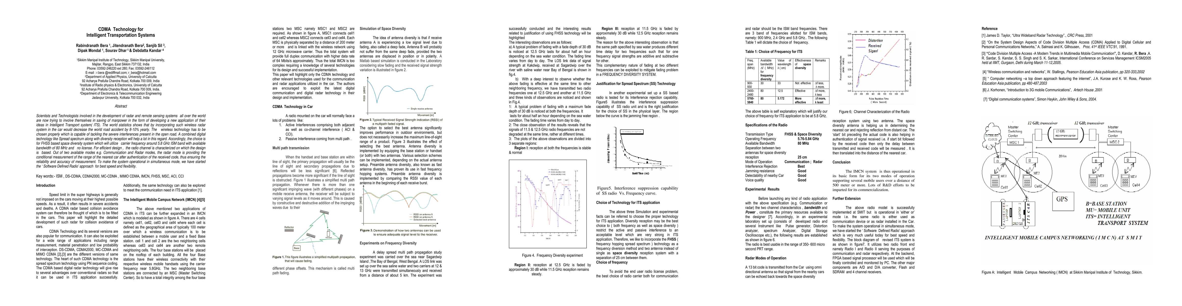Researchers explored using CDMA technology to improve Intelligent Transportation Systems by reducing road accidents by 8-10% through a wireless radar system. They proposed an FHSS-based space diversity system utilizing the 5.8 GHz ISM band for efficient design and measurement accuracy.