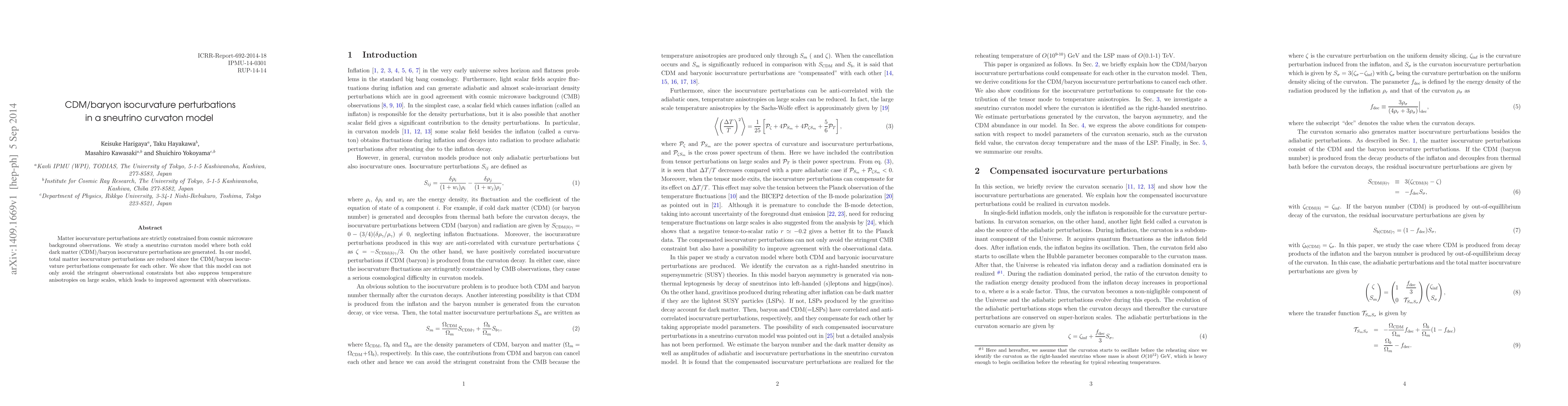 This paper investigates a sneutrino curvaton model generating CDM/baryon isocurvature perturbations, finding that these perturbations can compensate each other, reducing total matter isocurvature perturbations and improving agreement with cosmic microwave background observations.