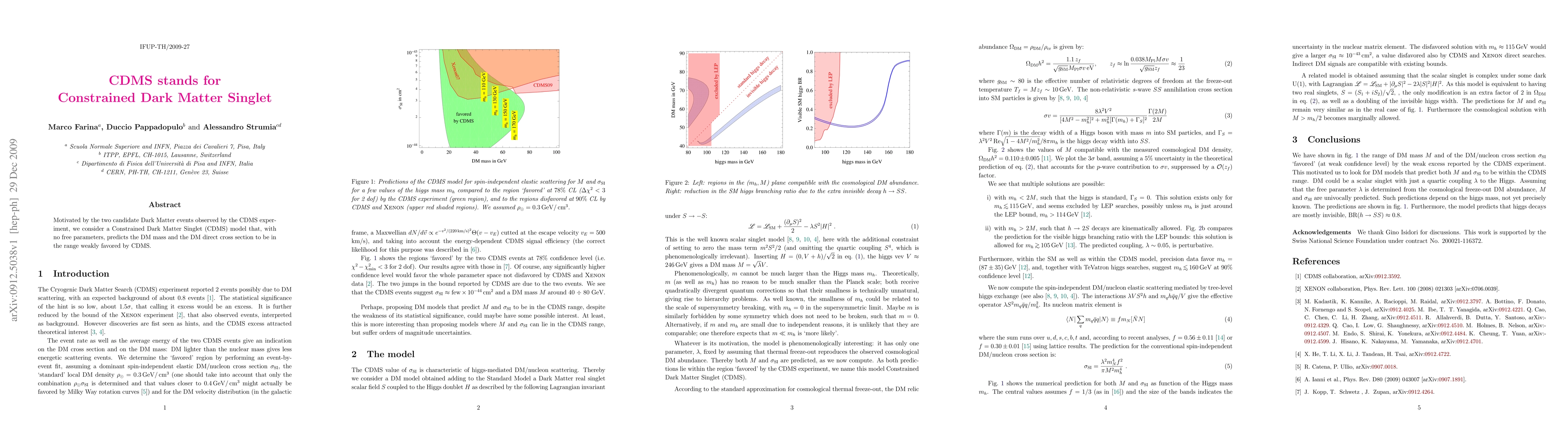 The paper proposes a Constrained Dark Matter Singlet (CDMS) model with no free parameters, predicting a DM mass and direct cross section within the range favored by CDMS' two observed weak DM events.