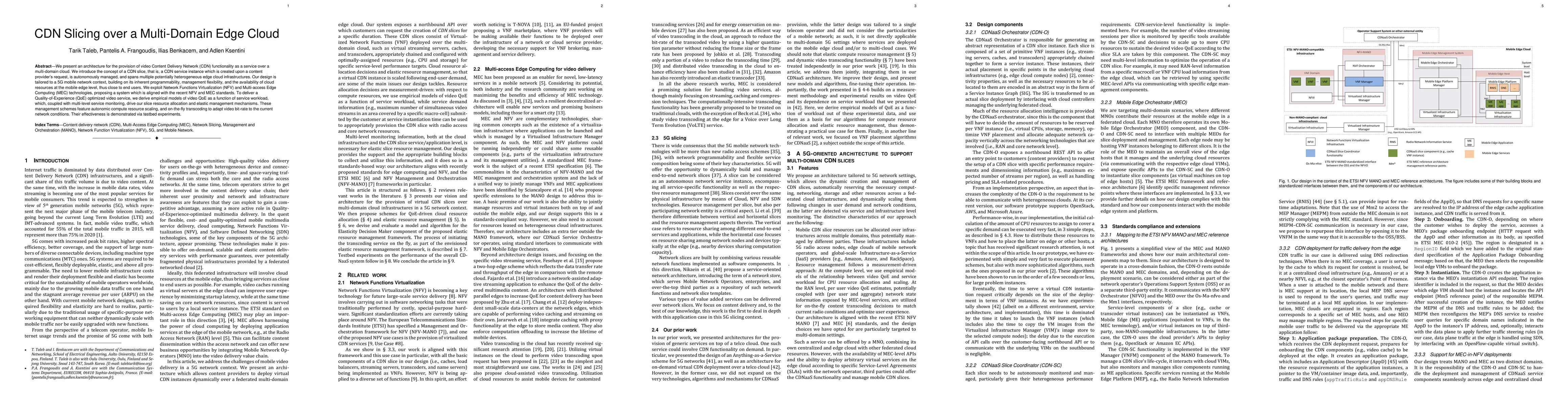 The paper proposes a CDN slice architecture for delivering video services over a multi-domain edge cloud, utilizing NFV and MEC. It introduces autonomous, workload-adaptive resource allocation and on-the-fly transcoding for optimized QoE, demonstrated through testbed experiments.