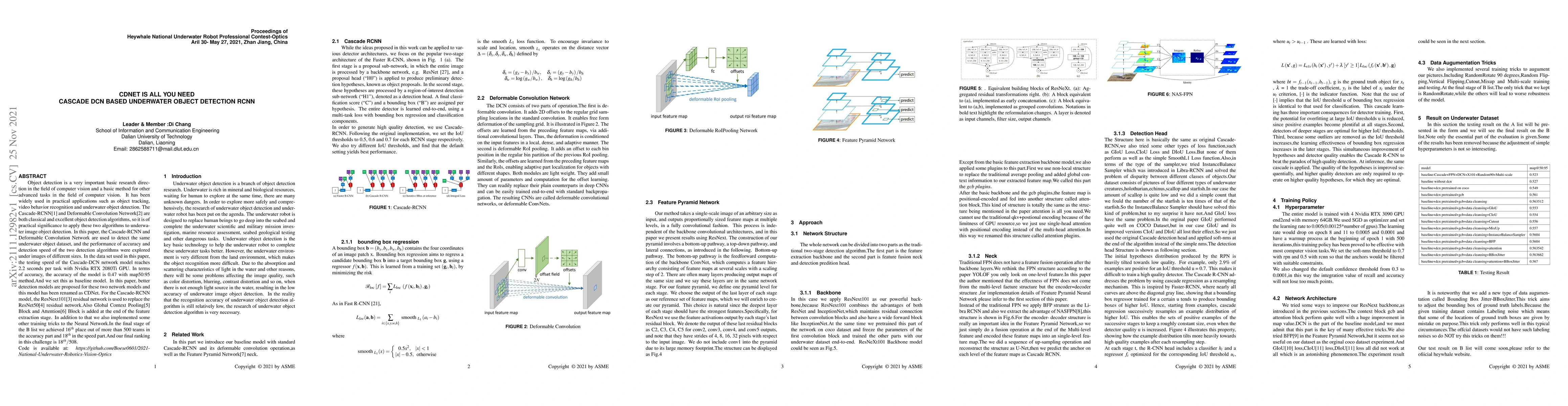 Summary: This paper proposes a Cascade-DCN based method for underwater object detection, evaluating its performance on optical and acoustics images using various engineering tricks and augmentation techniques. The approach leverages the strengths of Cascade RCNN and Deformable Convolution Networks for effective detection in challenging underwater environments.