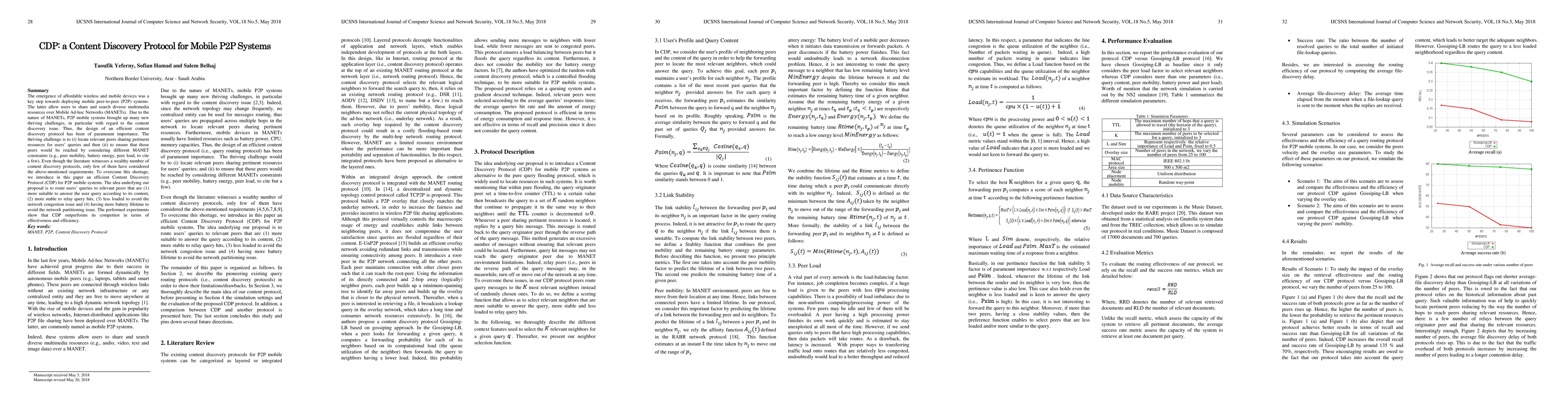 This paper introduces a Content Discovery Protocol (CDP) for mobile peer-to-peer (P2P) systems operating in Mobile Ad-hoc Networks (MANETs). CDP aims to efficiently locate relevant peers based on content, stability, network load, and battery life, outperforming existing protocols in both effectiveness and efficiency.