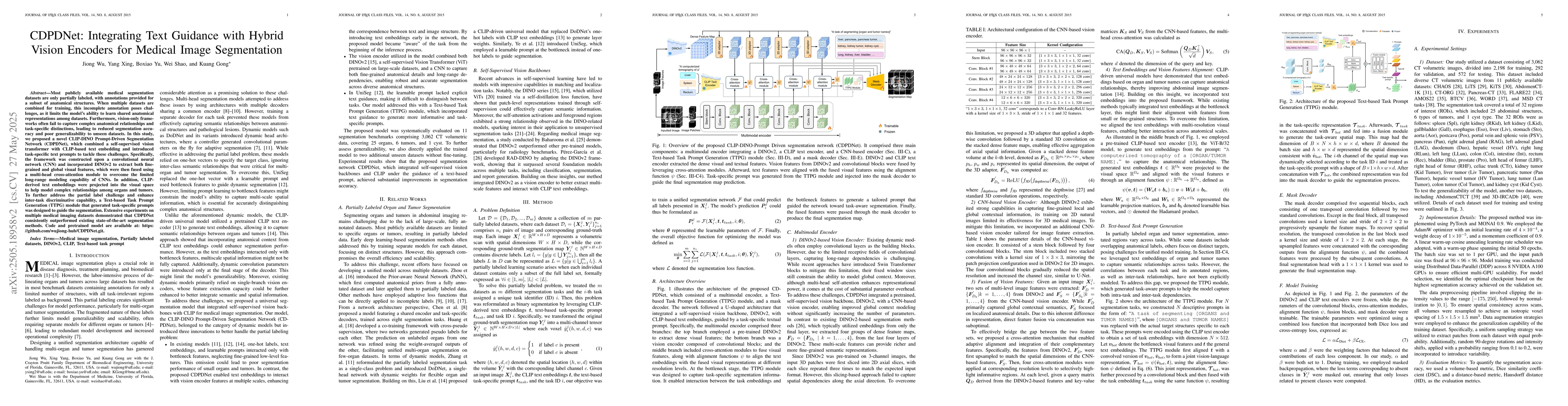 The research proposes CDPDNet, a segmentation network that integrates text guidance with hybrid vision encoders. It combines a CNN with DINOv2 for feature extraction, fuses features via multi-head cross-attention, and uses CLIP-derived text embeddings to model complex anatomical relationships. A Text-based Task Prompt Generation (TTPG) module is introduced for task-specific prompt generation.