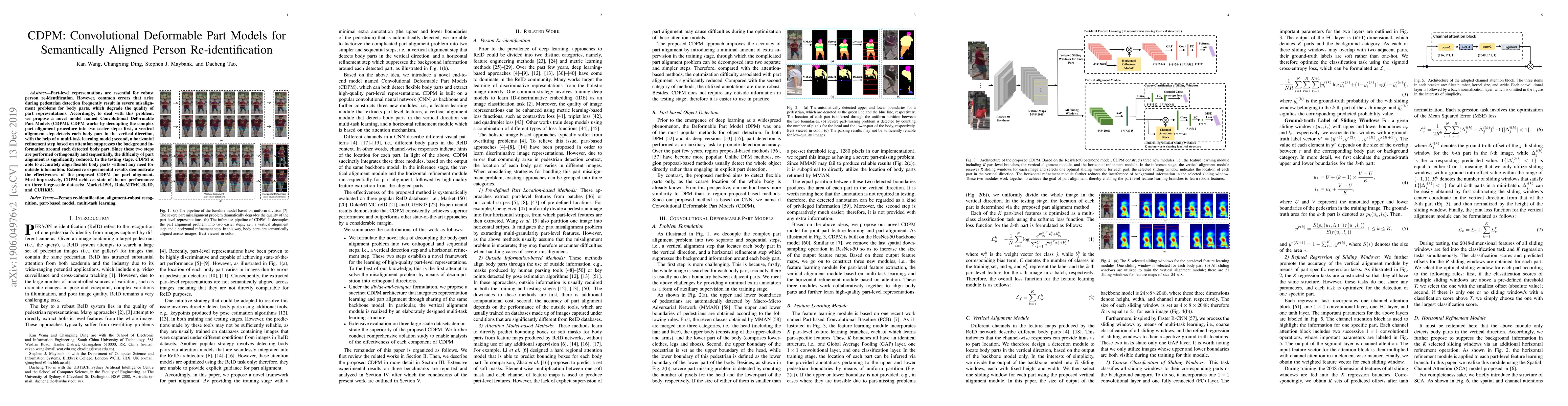 Part-level representations are essential for robust person re-identification. However, common errors that arise during pedestrian detection frequently result in severe misalignment problems for body parts, which degrade the quality of part representations. Accordingly, to deal with this problem, we propose a novel model named Convolutional Deformable Part Models (CDPM). CDPM works by decoupling the complex part alignment procedure into two easier steps: first, a vertical alignment step detects each body part in the vertical direction, with the help of a multi-task learning model; second, a horizontal refinement step based on attention suppresses the background information around each detected body part. Since these two steps are performed orthogonally and sequentially, the difficulty of part alignment is significantly reduced. In the testing stage, CDPM is able to accurately align flexible body parts without any need for outside information. Extensive experimental results demonstrate the effectiveness of the proposed CDPM for part alignment. Most impressively, CDPM achieves state-of-the-art performance on three large-scale datasets: Market-1501, DukeMTMC-ReID,and CUHK03.