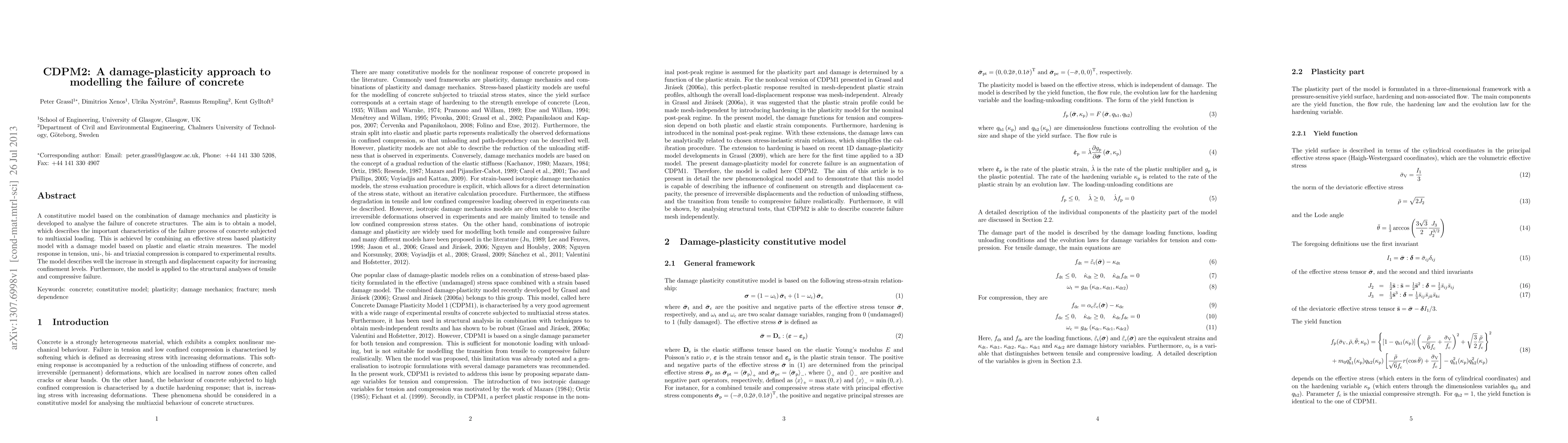 CDPM2 integrates damage mechanics and plasticity to model concrete failure under multiaxial loading, accurately capturing strength and displacement capacity improvements with increased confinement. The model is validated against experimental results for various loading conditions.