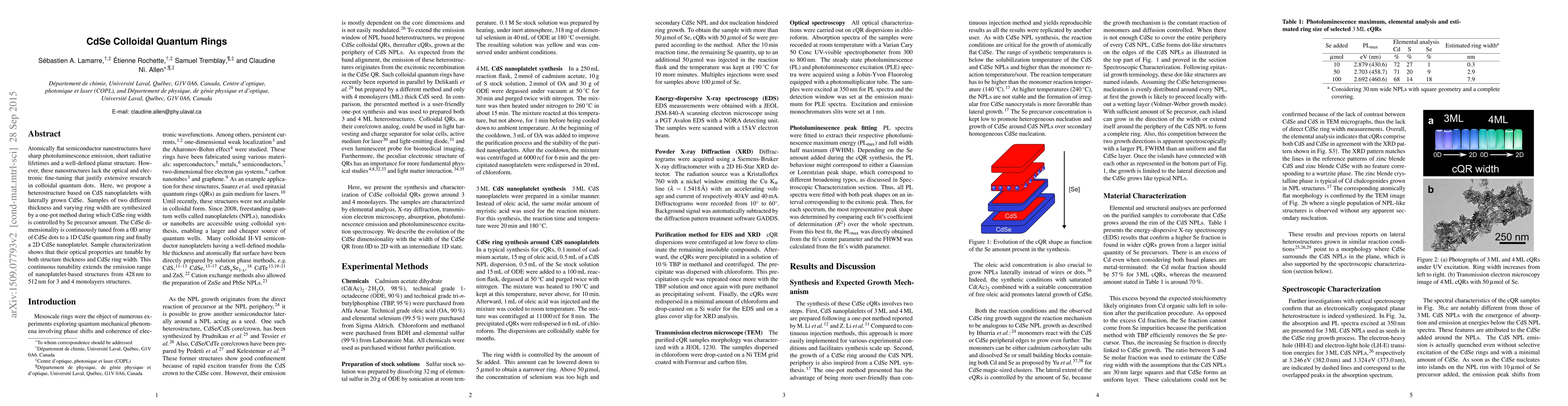 This paper proposes CdSe colloidal quantum rings formed by laterally growing CdSe on CdS nanoplatelets, synthesized via a one-pot method. The optical properties, including tunable emission ranging from 428 nm to 512 nm, are controlled by varying the CdSe ring width and structure thickness.