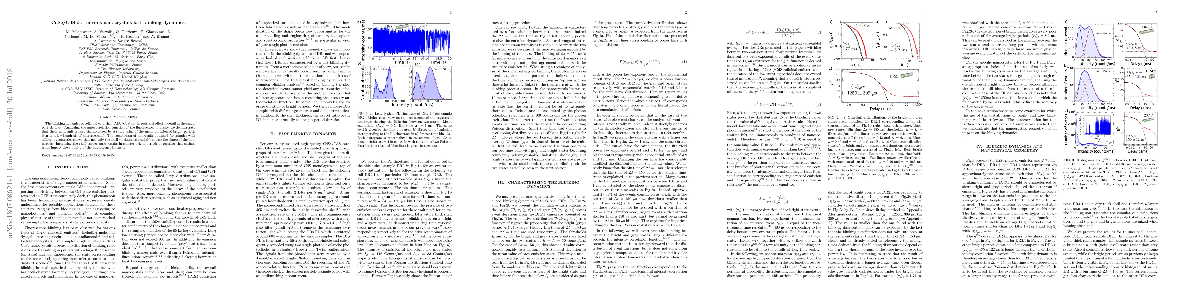 The blinking dynamics of colloidal core-shell CdSe/CdS dot-in-rods is studied in detail at the single particle level. Analyzing the autocorrelation function of the fluorescence intensity, we demonstrate that these nanoemitters are characterized by a short value of the mean duration of bright periods (ten to a few hundreds of microseconds). The comparison of the results obtained for samples with different geometries shows that not only the shell thickness is crucial but also the shape of the dot- in-rods. Increasing the shell aspect ratio results in shorter bright periods suggesting that surface traps impact the stability of the fluorescence intensity.