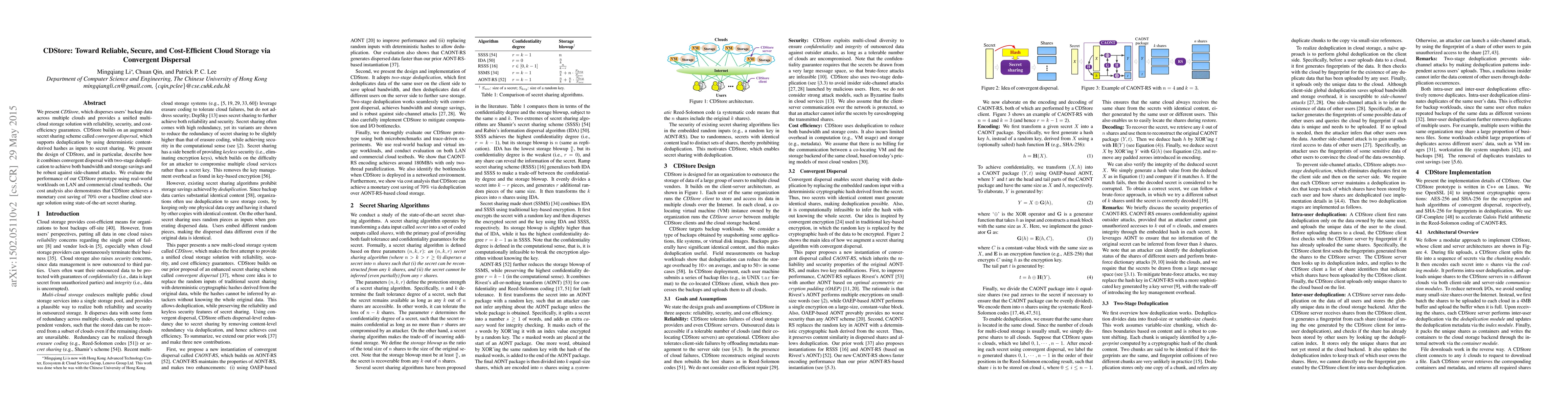 CDStore disperses backup data across multiple clouds using convergent dispersal for reliability, security, and cost-efficiency. It employs two-stage deduplication and augmented secret sharing to achieve bandwidth and storage savings while being robust against side-channel attacks.