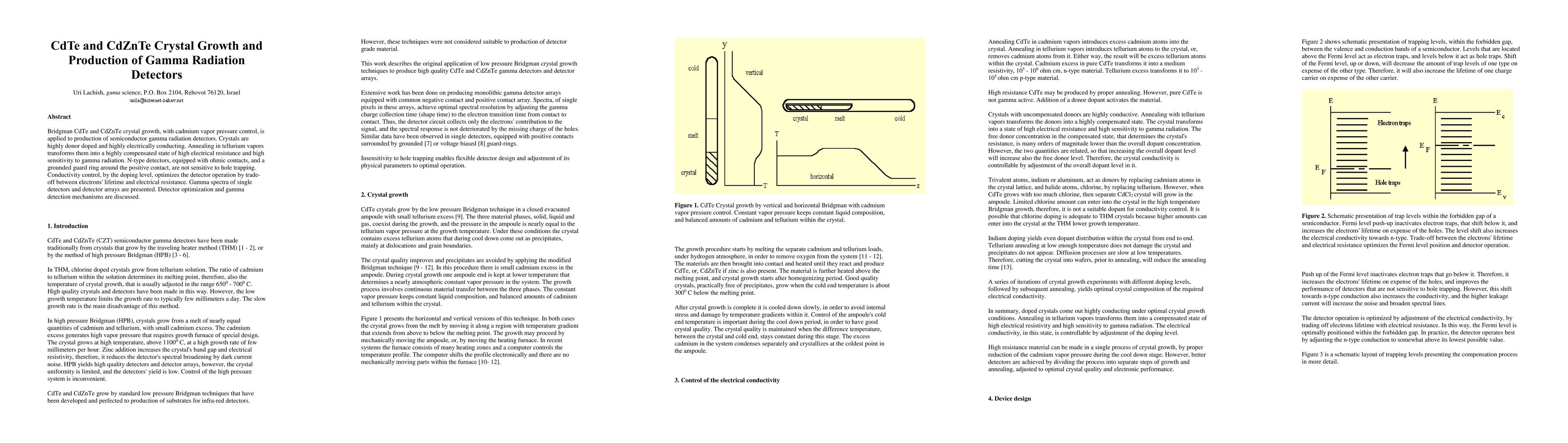 This paper explores the Bridgman growth technique for CdTe and CdZnTe crystals, focusing on optimizing their production for gamma radiation detectors. The crystals undergo annealing to achieve high resistance and sensitivity, and the study discusses the balance between conductivity control and detector performance, presenting gamma spectra and detector optimization strategies.