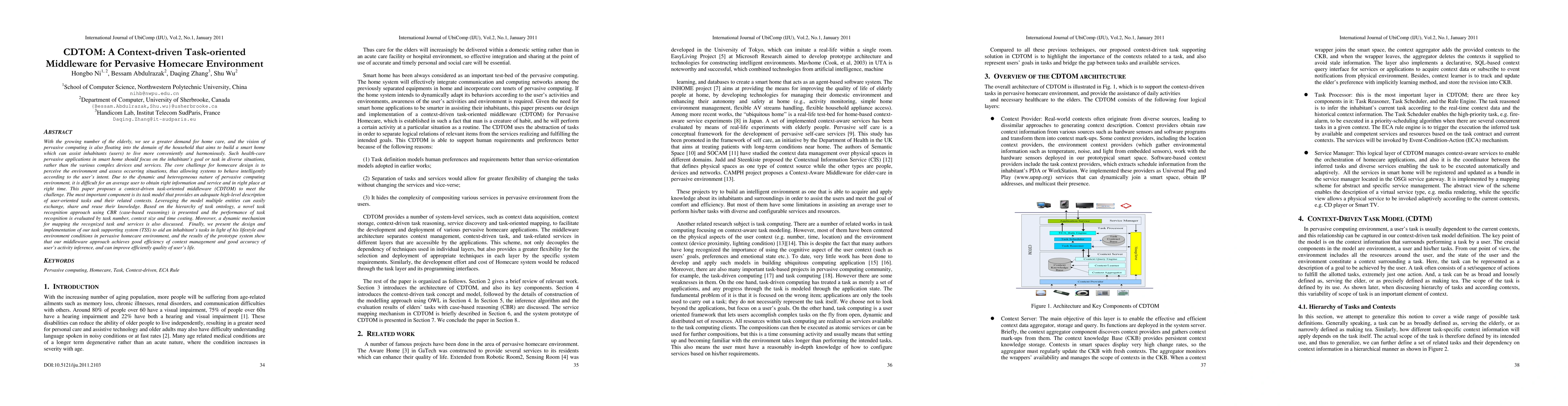The paper proposes CDTOM, a context-driven task-oriented middleware for smart home environments, designed to assist elderly inhabitants by recognizing and adapting to their tasks and contexts. The middleware employs a task model and case-based reasoning for task recognition, demonstrating efficiency in context management and accuracy in activity inference.