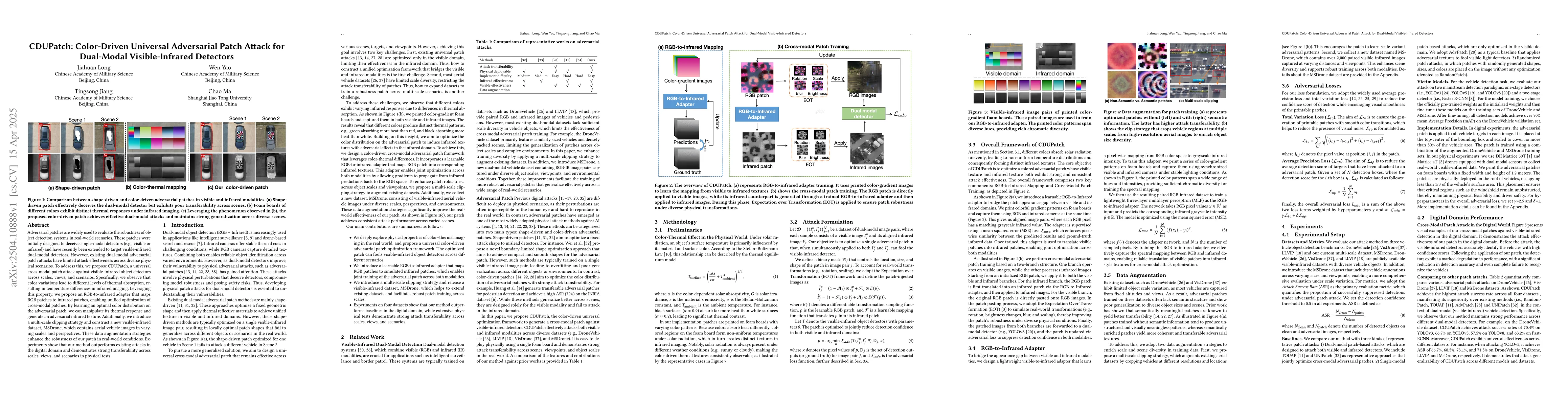 The paper proposes CDUPatch, a color-driven universal adversarial patch attack targeting dual-modal visible-infrared detectors. It leverages the color-thermal relationship in real-world materials, introducing an RGB-to-infrared adapter for joint cross-modal optimization. Multi-scale clipping strategies and a new dataset, MSDrone, are also proposed to enhance patch robustness.