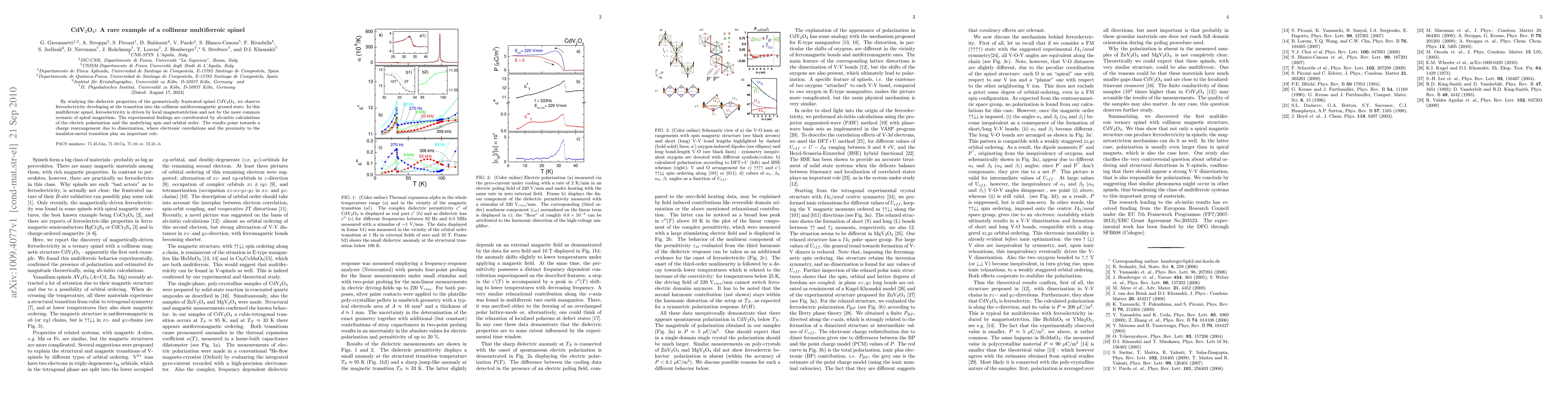 CdV2O4 exhibits ferroelectricity driven by magnetostriction in its collinear antiferromagnetic state, distinguishing it from typical spiral-driven multiferroics. Ab-initio calculations support the role of electronic correlations and charge rearrangement due to dimerization near the insulator-metal transition.