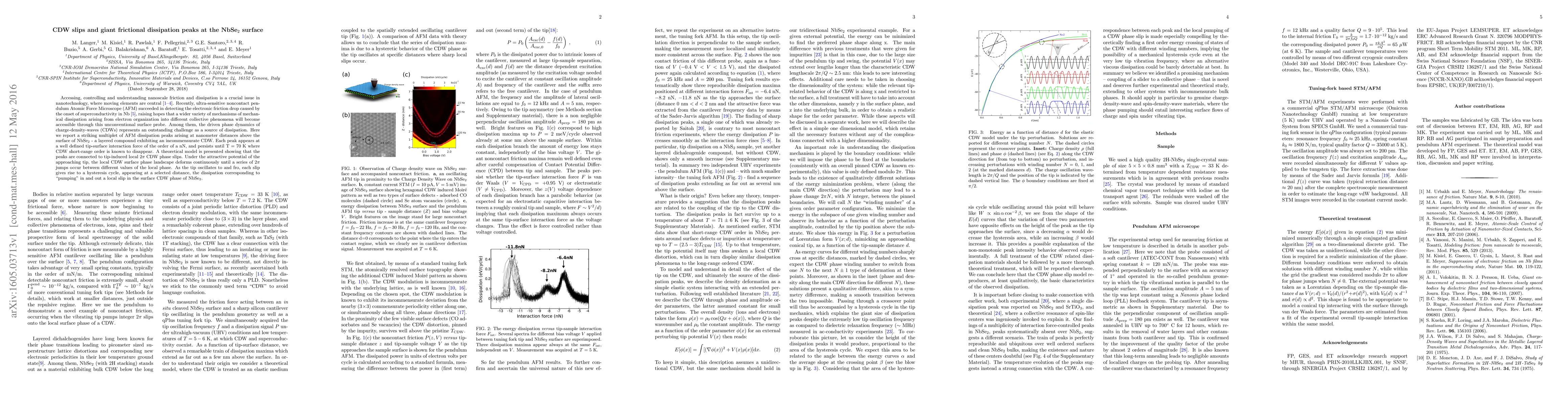Accessing, controlling and understanding nanoscale friction and dissipation is a crucial issue in nanotechnology, where moving elements are central. Recently, ultra-sensitive noncontact pendulum Atomic Force Microscope (AFM) succeeded in detecting the electronic friction drop caused by the onset of superconductivity in Nb, raising hopes that a wider variety of mechanisms of mechanical dissipation arising from electron organization into different collective phenomena will become accessible through this unconventional surface probe. Among them, the driven phase dynamics of charge-density-waves (CDWs) represents an outstanding challenge as a source of dissipation. Here we report a striking multiplet of AFM dissipation peaks arising at nanometer distances above the surface of NbSe$_2$ - a layered compound exhibiting an incommensurate CDW. Each peak appears at a well defined tip-surface interaction force of the order of a nN, and persists until T=70K where CDW short-range order is known to disappear. A theoretical model is presented showing that the peaks are connected to tip-induced local 2$\pi$ CDW phase slips. Under the attractive potential of the approaching tip, the local CDW surface phase landscape deforms continuously until a series of 2$\pi$ jumps occur between different values of the local phase. As the tip oscillates to and fro, each slip gives rise to a hysteresis cycle, appearing at a selected distance, the dissipation corresponding to "pumping" in and out a local slip in the surface CDW phase of NbSe$_2$.