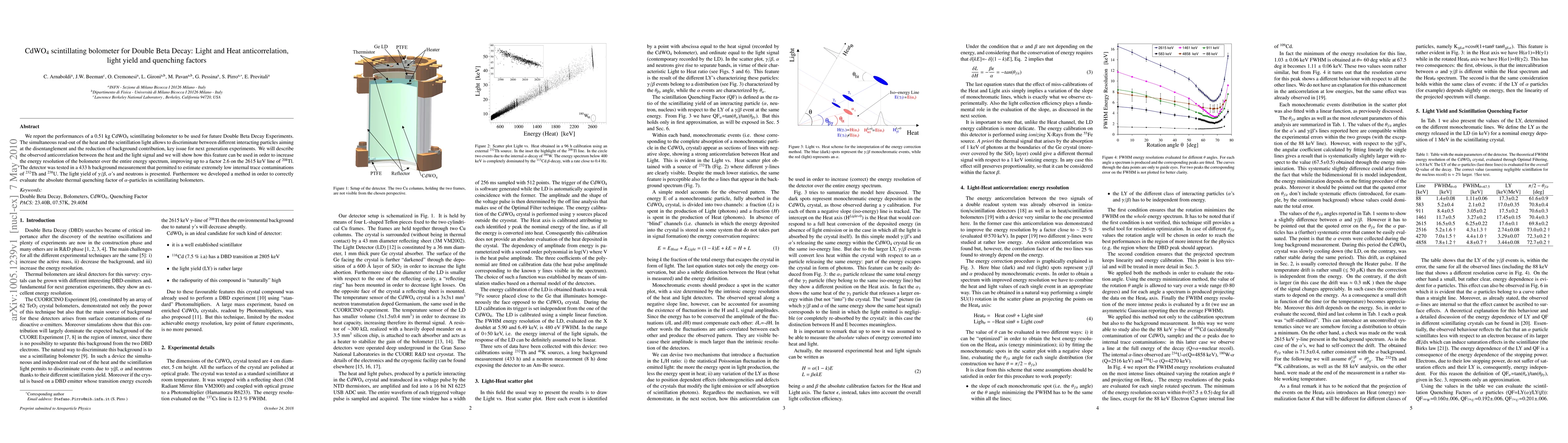This paper evaluates a 0.51 kg CdWO4 scintillating bolometer for Double Beta Decay experiments, demonstrating its ability to discriminate particle interactions via heat-light signal anticorrelation, which enhances energy resolution by up to 2.6 times. The study also assesses internal contamination levels and develops a method for evaluating thermal quenching factors for alpha particles.
