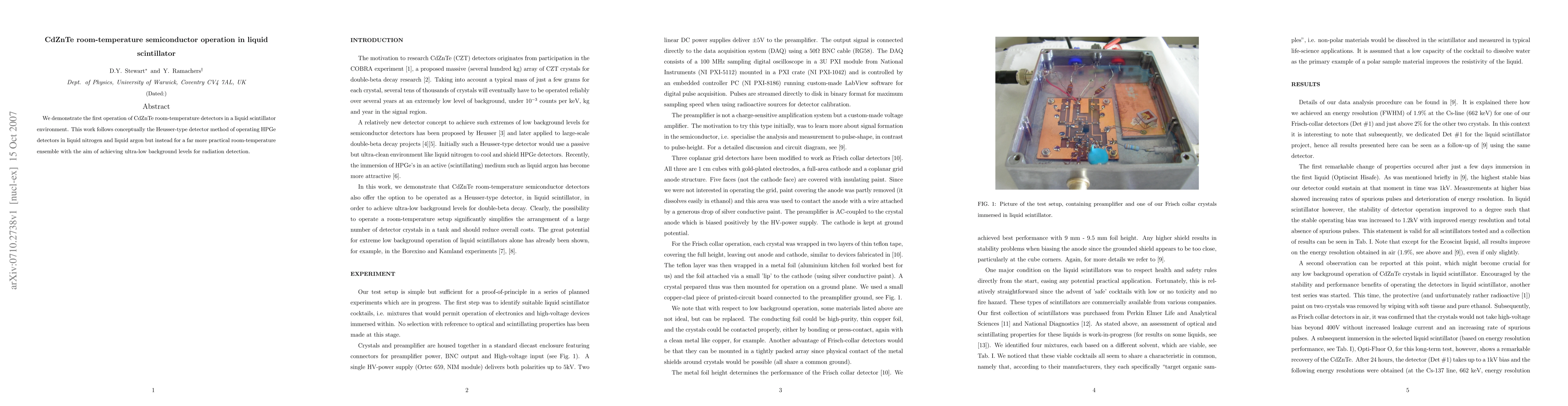 Summary: This paper presents the first successful operation of CdZnTe semiconductor detectors at room temperature within a liquid scintillator environment, aiming to achieve ultra-low background radiation detection in a practical, non-cryogenic setup.
