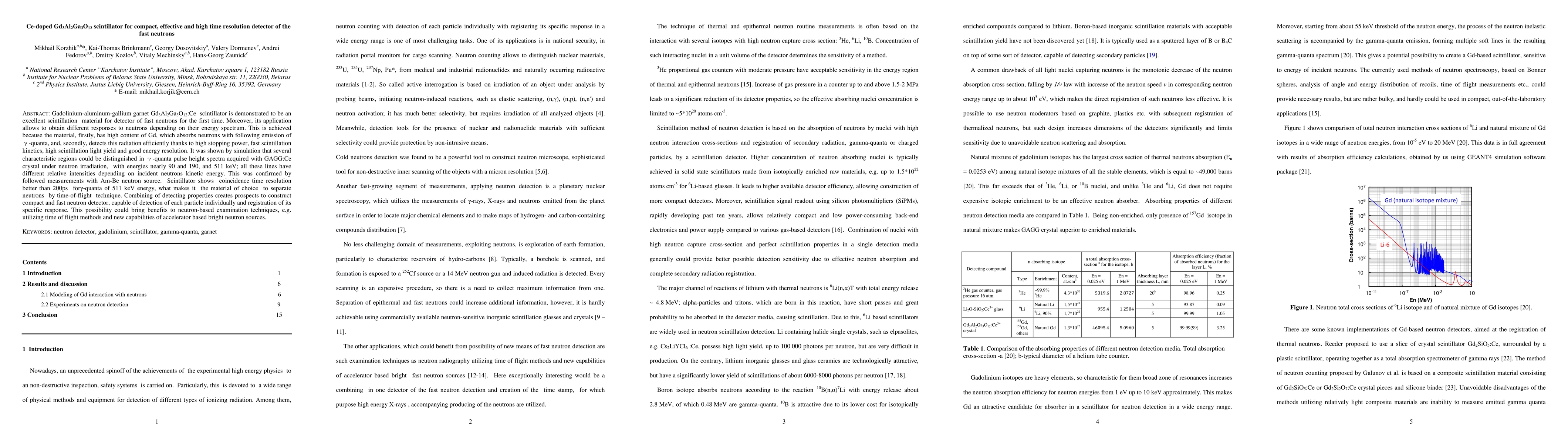 Gadolinium-aluminum-gallium garnet Gd${}_{3}$Al${}_{2}$Ga${}_{3}$O${}_{12}$:Ce scintillator is demonstrated to be an excellent scintillation material for detector of fast neutrons for the first time. Moreover, its application allows to obtain different responses to neutrons depending on their energy spectrum. This is achieved because the material, firstly, has high content of Gd, which absorbs neutrons with following emission of $\gamma$-quanta, and, secondly, detects this radiation efficiently thanks to high stopping power, fast scintillation kinetics, high scintillation light yield and good energy resolution. It was shown by simulation that several characteristic regions could be distinguished in $\gamma$-quanta pulse height spectra acquired with GAGG:Ce crystal under neutron irradiation, with energies nearly 90 and 190, and 511 keV; all these lines have different relative intensities depending on incident neutrons kinetic energy. This was confirmed by followed measurements with Am-Be neutron source. Scintillator shows coincidence time resolution better than 200ps for$\gamma$-quanta of 511 keV energy, what makes it the material of choice to separate neutrons by time-of-flight technique. Combining of detecting properties creates prospects to construct compact and fast neutron detector, capable of detection of each particle individually and registration of its specific response. This possibility could bring benefits to neutron-based examination techniques, e.g. utilizing time of flight methods and new capabilities of accelerator based bright neutron sources.