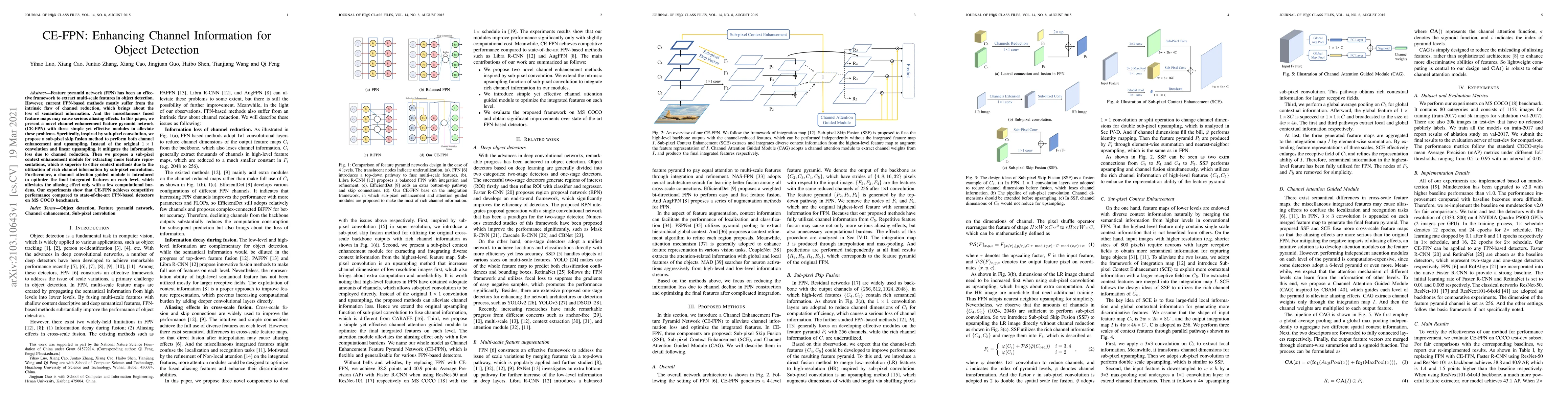 The paper introduces CE-FPN, a novel channel enhancement feature pyramid network to improve object detection by addressing channel reduction issues in FPNs. It uses sub-pixel skip fusion, sub-pixel context enhancement, and channel attention guided modules to enhance feature representation and mitigate aliasing effects, achieving competitive performance on the MSCOCO benchmark.