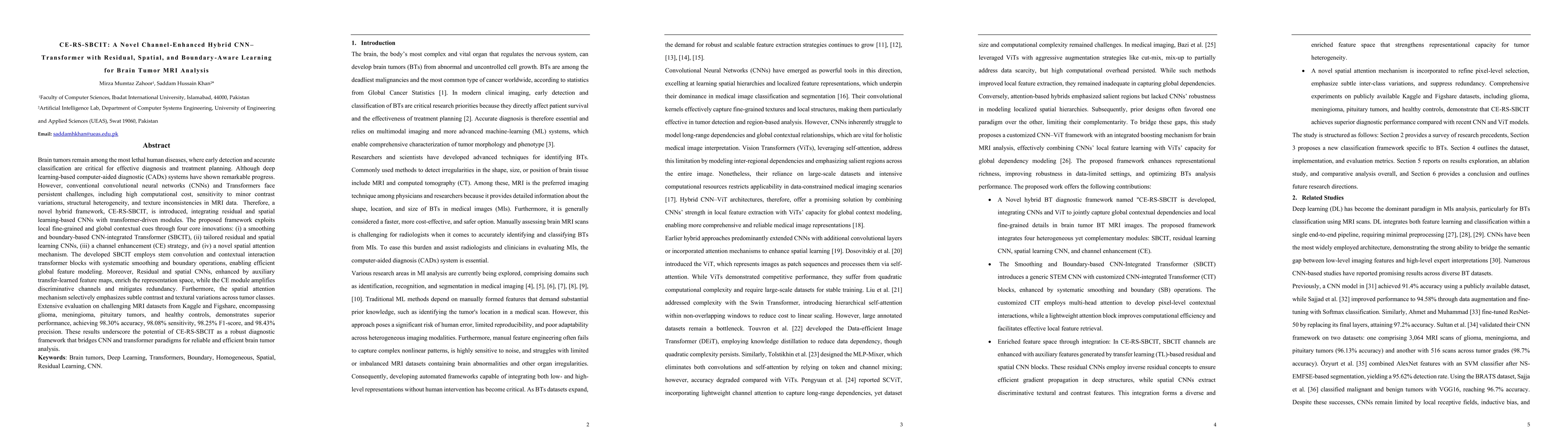 Brain tumors remain among the most lethal human diseases, where early detection and accurate classification are critical for effective diagnosis and treatment planning. Although deep learning-based computer-aided diagnostic (CADx) systems have shown remarkable progress. However, conventional convolutional neural networks (CNNs) and Transformers face persistent challenges, including high computational cost, sensitivity to minor contrast variations, structural heterogeneity, and texture inconsistencies in MRI data. Therefore, a novel hybrid framework, CE-RS-SBCIT, is introduced, integrating residual and spatial learning-based CNNs with transformer-driven modules. The proposed framework exploits local fine-grained and global contextual cues through four core innovations: (i) a smoothing and boundary-based CNN-integrated Transformer (SBCIT), (ii) tailored residual and spatial learning CNNs, (iii) a channel enhancement (CE) strategy, and (iv) a novel spatial attention mechanism. The developed SBCIT employs stem convolution and contextual interaction transformer blocks with systematic smoothing and boundary operations, enabling efficient global feature modeling. Moreover, Residual and spatial CNNs, enhanced by auxiliary transfer-learned feature maps, enrich the representation space, while the CE module amplifies discriminative channels and mitigates redundancy. Furthermore, the spatial attention mechanism selectively emphasizes subtle contrast and textural variations across tumor classes. Extensive evaluation on challenging MRI datasets from Kaggle and Figshare, encompassing glioma, meningioma, pituitary tumors, and healthy controls, demonstrates superior performance, achieving 98.30% accuracy, 98.08% sensitivity, 98.25% F1-score, and 98.43% precision.