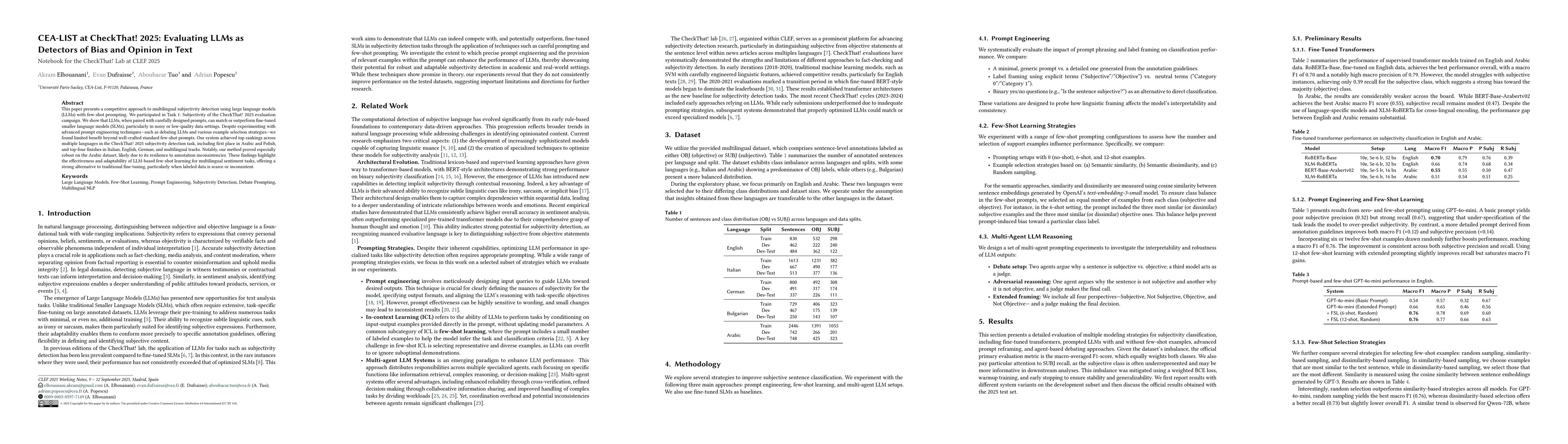 The research employs large language models (LLMs) with few-shot prompting for multilingual subjectivity detection, participating in Task 1: Subjectivity of CheckThat! 2025. Experiments include advanced prompt engineering techniques like debating LLMs and various example selection strategies.