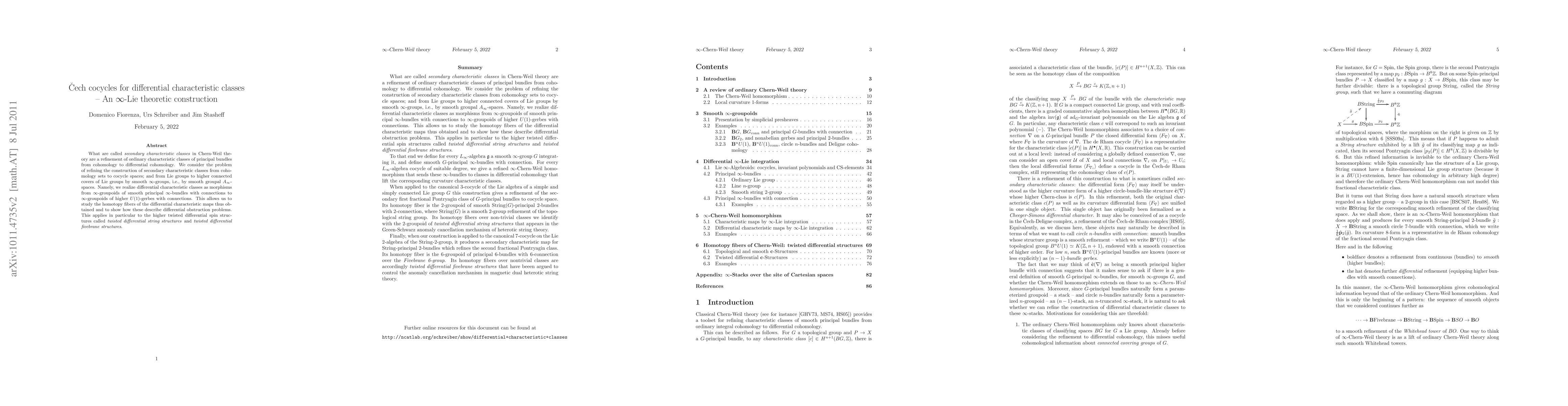 This paper constructs secondary characteristic classes using infinity-Lie theory, refining ordinary characteristic classes from cohomology sets to cocycle spaces and from Lie groups to smooth infinity-groups. It realizes differential characteristic classes as morphisms between infinity-groupoids of principal bundles and U(1)-gerbes, describing differential obstruction problems.
