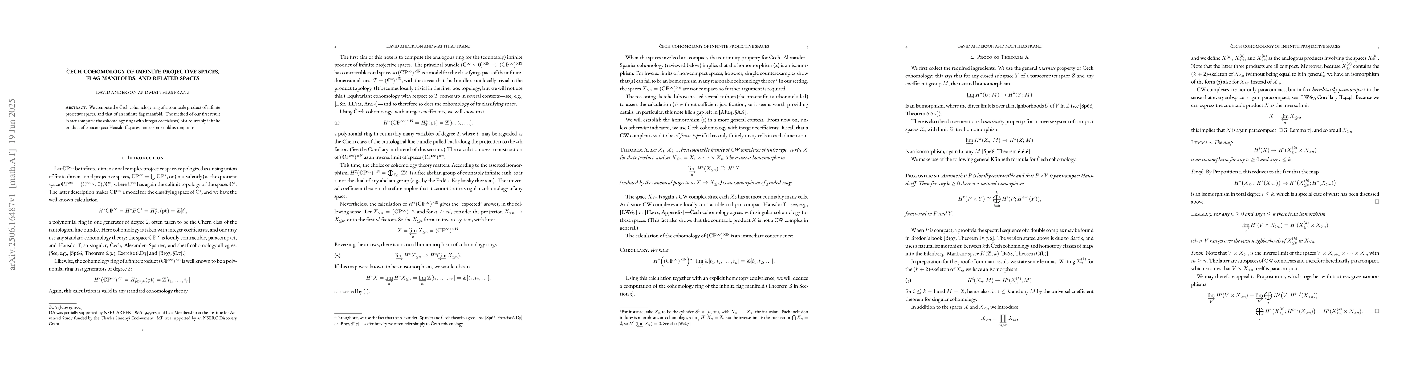 We compute the \v{C}ech cohomology ring of a countable product of infinite projective spaces, and that of an infinite flag manifold. The method of our first result in fact computes the cohomology ring (with integer coefficients) of a countably infinite product of paracompact Hausdorff spaces, under some mild assumptions.