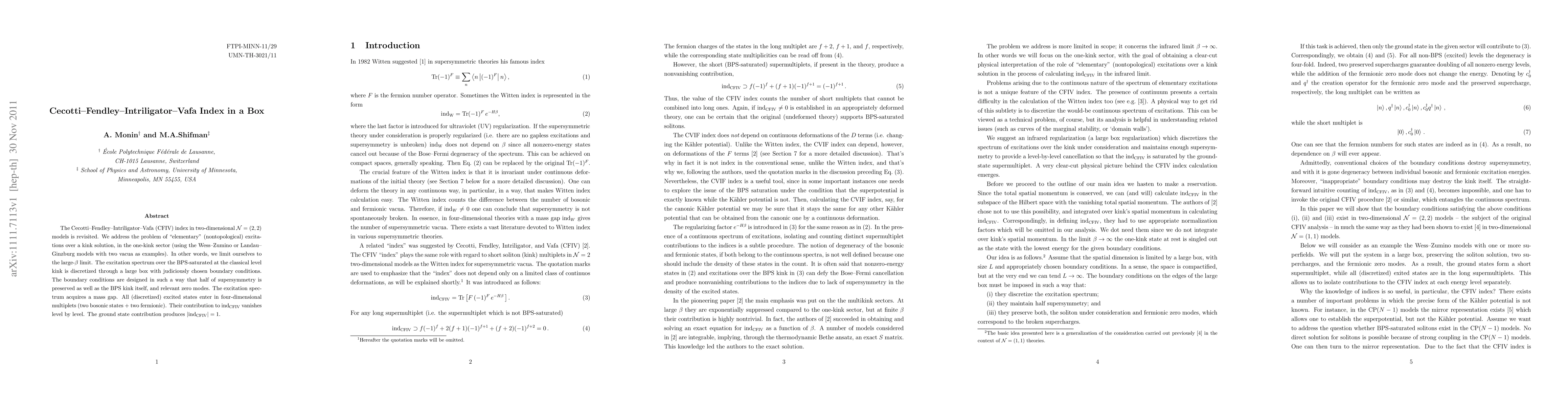 The Cecotti-Fendley-Intriligator-Vafa (CFIV) index in two-dimensional ${\mathcal N} =(2,2)$ models is revisited. We address the problem of "elementary" (nontopological) excitations over a kink solution, in the one-kink sector (using the Wess-Zumino or Landau-Ginzburg models with two vacua as examples). In other words, we limit ourselves to the large-$\beta$ limit. The excitation spectrum over the BPS-saturated at the classical level kink is discretized through a large box with judiciously chosen boundary conditions. The boundary conditions are designed in such a way that half of supersymmetry is preserved as well as the BPS kink itself, and relevant zero modes. The excitation spectrum acquires a mass gap. All (discretized) excited states enter in four-dimensional multiplets (two bosonic states + two fermionic). Their contribution to $\mathrm{ind}_{\rm CFIV}$ vanishes level by level. The ground state contribution produces $|\mathrm{ind}_{\rm CFIV}|=1$.