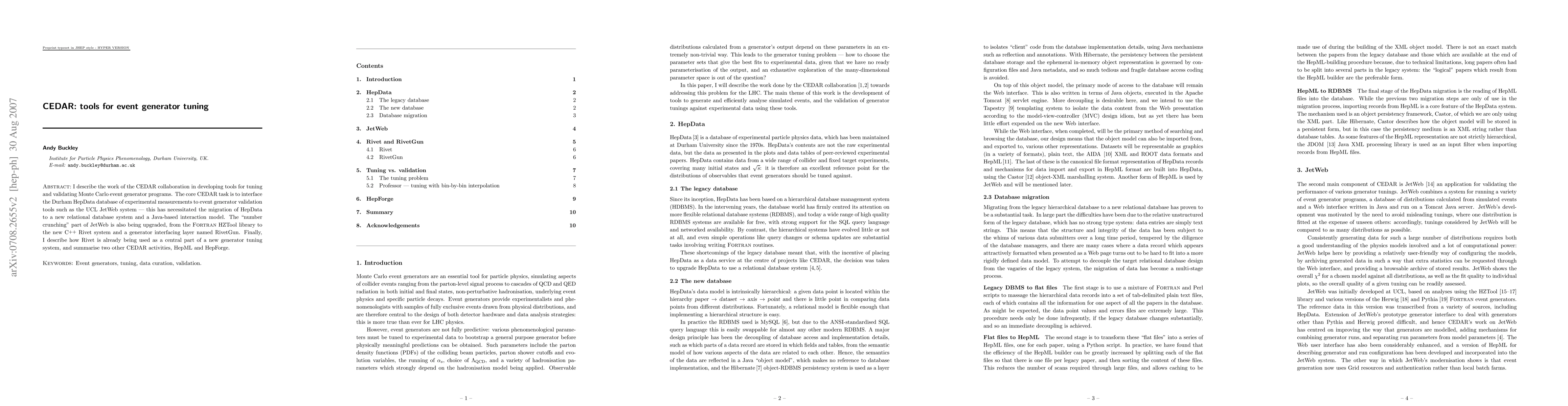 The CEDAR collaboration has developed tools for tuning and validating Monte Carlo event generators, interfacing the Durham HepData database with the UCL JetWeb system, and upgrading the "number crunching" component from Fortran HZTool to the C++ Rivet system. Additionally, CEDAR is involved in HepML and HepForge projects.