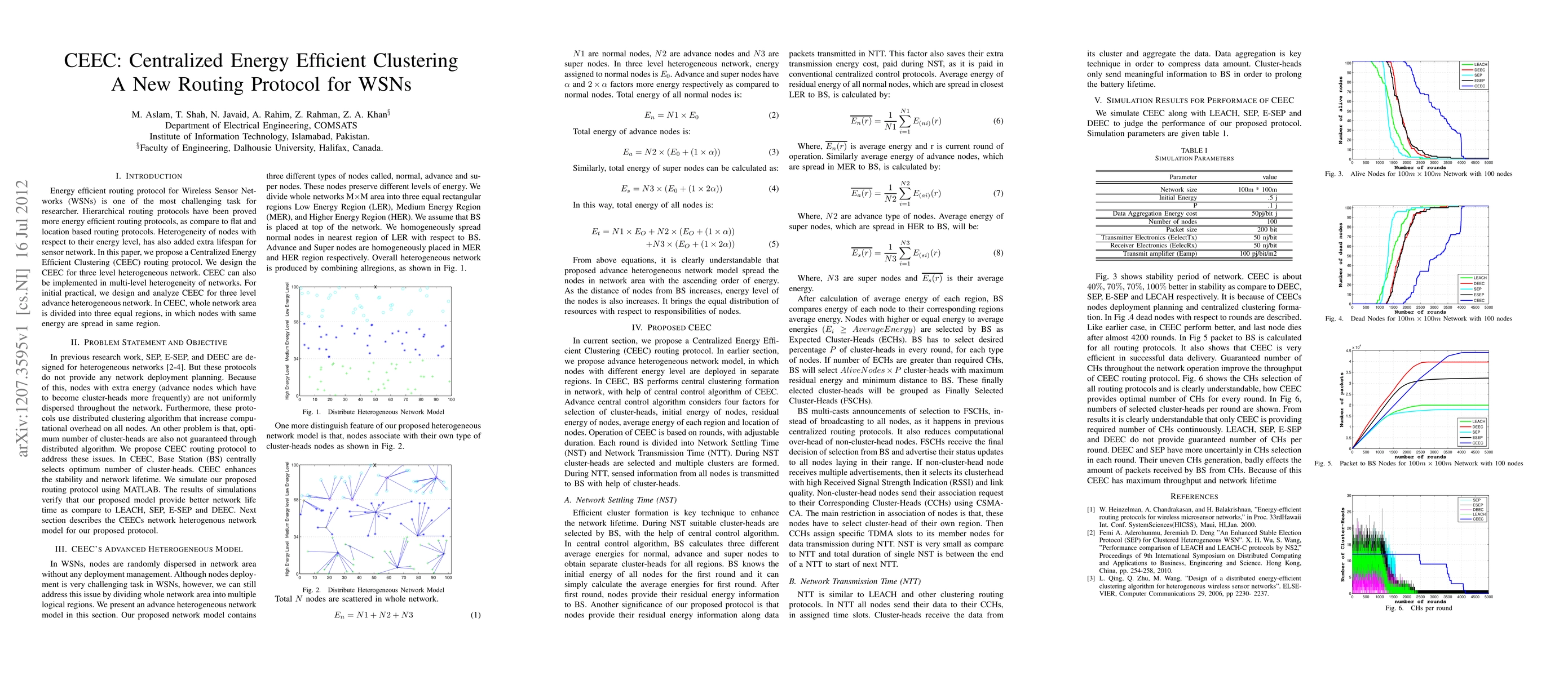 Title: CEEC: Centralized Energy Efficient Clustering A New Routing Protocol for WSNs Summary: This paper proposes a Centralized Energy Efficient Clustering (CEEC) routing protocol for Wireless Sensor Networks (WSNs), designed for three-level heterogeneous networks, aiming to enhance energy efficiency and extend the network's lifespan by clustering nodes based on their energy levels.