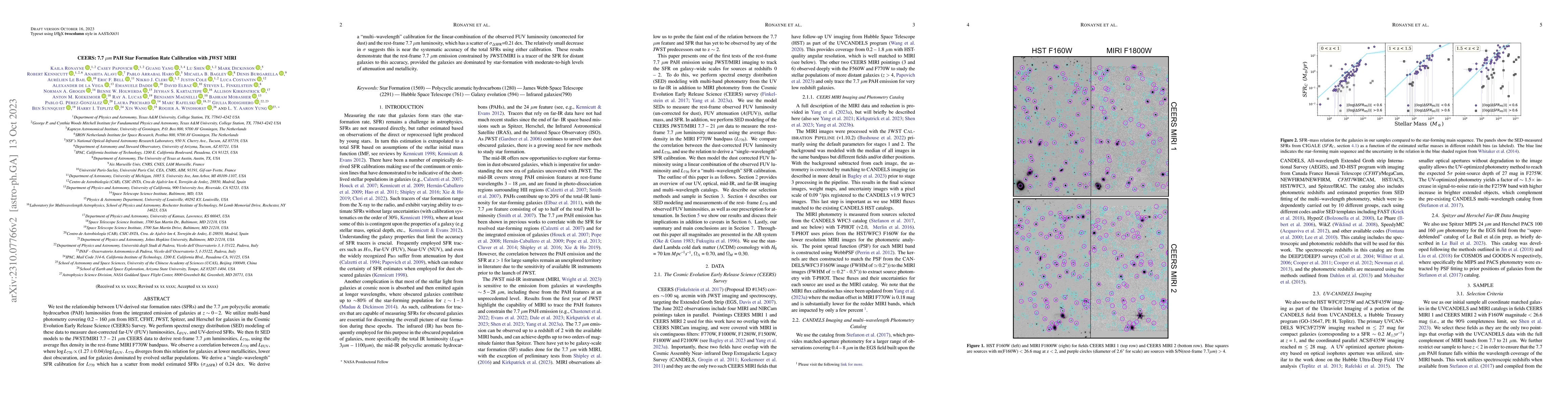We test the relationship between UV-derived star formation rates (SFRs) and the 7.7 ${\mu}$m polycyclic aromatic hydrocarbon (PAH) luminosities from the integrated emission of galaxies at z ~ 0 - 2. We utilize multi-band photometry covering 0.2 - 160 ${\mu}$m from HST, CFHT, JWST, Spitzer, and Herschel for galaxies in the Cosmic Evolution Early Release Science (CEERS) Survey. We perform spectral energy distribution (SED) modeling of these data to measure dust-corrected far-UV (FUV) luminosities, $L_{FUV}$, and UV-derived SFRs. We then fit SED models to the JWST/MIRI 7.7 - 21 ${\mu}$m CEERS data to derive rest-frame 7.7 ${\mu}$m luminosities, $L_{770}$, using the average flux density in the rest-frame MIRI F770W bandpass. We observe a correlation between $L_{770}$ and $L_{FUV}$, where log $L_{770}$ is proportional to (1.27+/-0.04) log $L_{FUV}$. $L_{770}$ diverges from this relation for galaxies at lower metallicities, lower dust obscuration, and for galaxies dominated by evolved stellar populations. We derive a "single-wavelength" SFR calibration for $L_{770}$ which has a scatter from model estimated SFRs (${{\sigma}_{{\Delta}SFR}}$) of 0.24 dex. We derive a "multi-wavelength" calibration for the linear combination of the observed FUV luminosity (uncorrected for dust) and the rest-frame 7.7 ${\mu}$m luminosity, which has a scatter of ${{\sigma}_{{\Delta}SFR}}$ = 0.21 dex. The relatively small decrease in ${\sigma}$ suggests this is near the systematic accuracy of the total SFRs using either calibration. These results demonstrate that the rest-frame 7.7 ${\mu}$m emission constrained by JWST/MIRI is a tracer of the SFR for distant galaxies to this accuracy, provided the galaxies are dominated by star-formation with moderate-to-high levels of attenuation and metallicity.