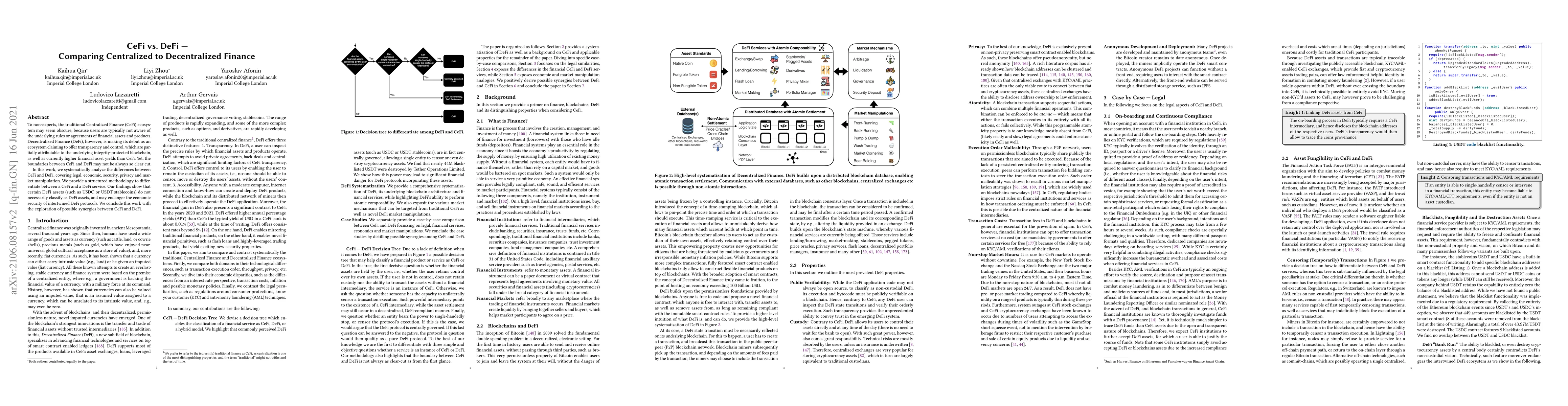 This paper systematically compares Centralized Finance (CeFi) and Decentralized Finance (DeFi), analyzing their differences in legal, economic, security, privacy, and market manipulation aspects. It reveals that some DeFi assets, like USDC or USDT stablecoins, may not fully align with DeFi principles and could threaten the security of interconnected protocols, suggesting potential synergies between CeFi and DeFi.