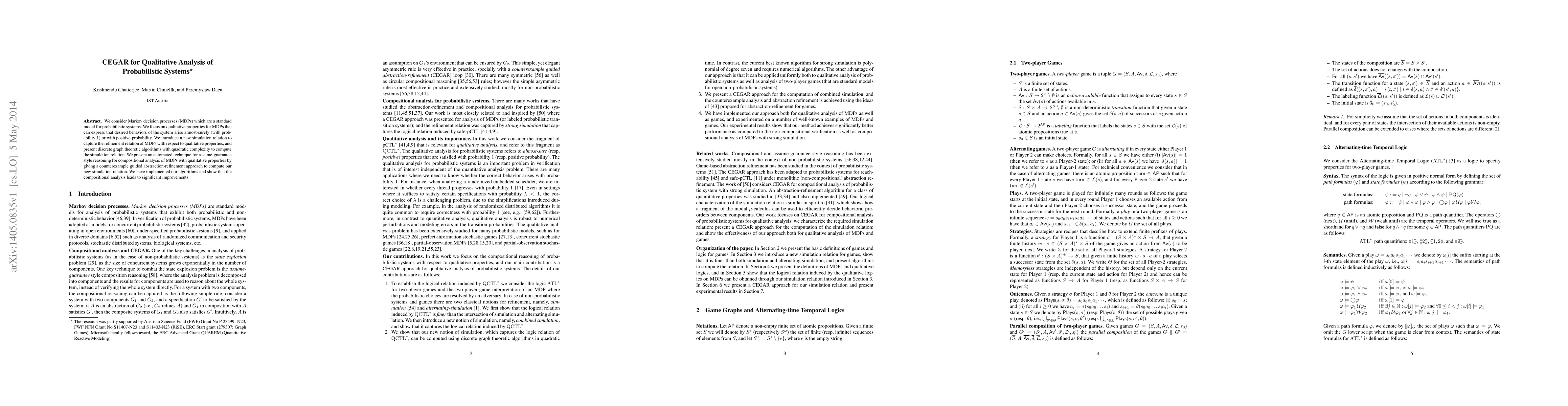This paper introduces a new simulation relation for Markov decision processes (MDPs) to analyze qualitative properties, such as behaviors occurring almost-surely or with positive probability. It presents a CEGAR (Counter-Example Guided Abstraction-Refinement) technique for automated compositional analysis, demonstrating significant improvements through implementation.
