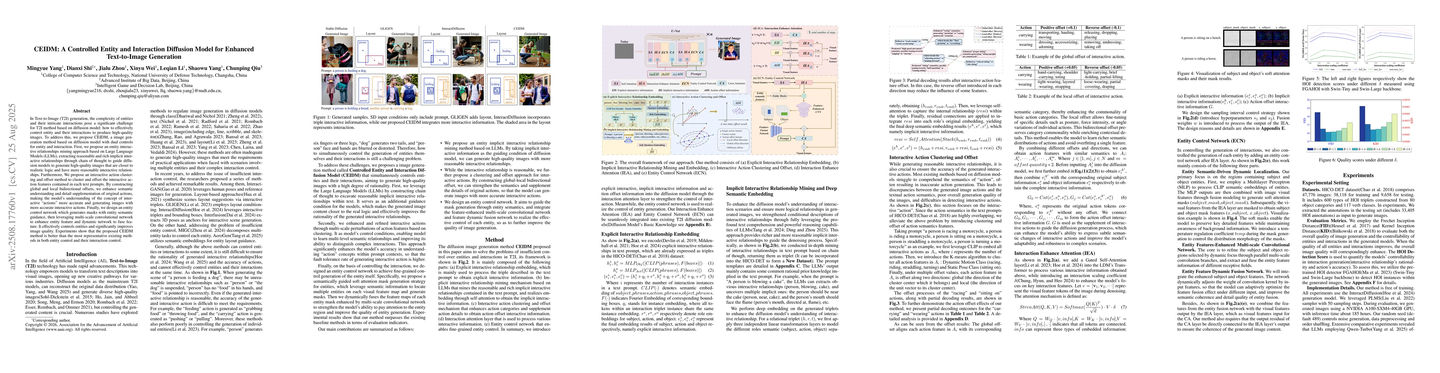 In Text-to-Image (T2I) generation, the complexity of entities and their intricate interactions pose a significant challenge for T2I method based on diffusion model: how to effectively control entity and their interactions to produce high-quality images. To address this, we propose CEIDM, a image generation method based on diffusion model with dual controls for entity and interaction. First, we propose an entity interactive relationships mining approach based on Large Language Models (LLMs), extracting reasonable and rich implicit interactive relationships through chain of thought to guide diffusion models to generate high-quality images that are closer to realistic logic and have more reasonable interactive relationships. Furthermore, We propose an interactive action clustering and offset method to cluster and offset the interactive action features contained in each text prompts. By constructing global and local bidirectional offsets, we enhance semantic understanding and detail supplementation of original actions, making the model's understanding of the concept of interactive "actions" more accurate and generating images with more accurate interactive actions. Finally, we design an entity control network which generates masks with entity semantic guidance, then leveraging multi-scale convolutional network to enhance entity feature and dynamic network to fuse feature. It effectively controls entities and significantly improves image quality. Experiments show that the proposed CEIDM method is better than the most representative existing methods in both entity control and their interaction control.