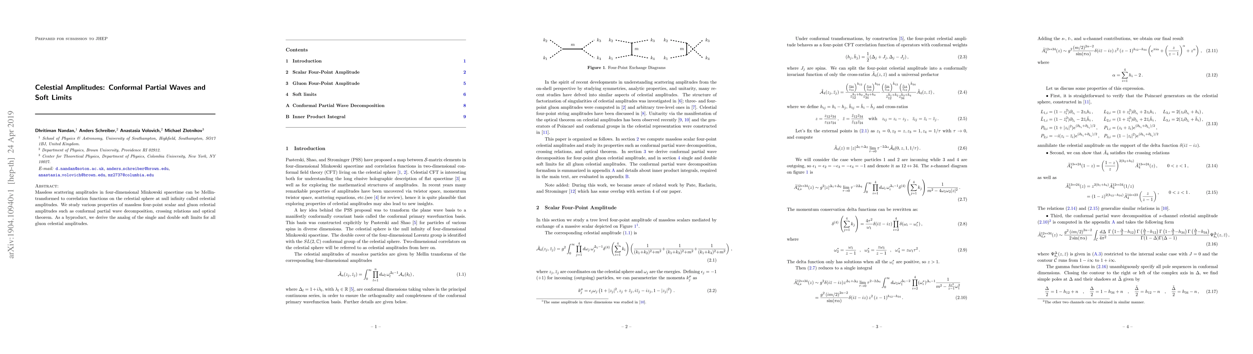 This paper investigates four-point massless scattering amplitudes through their Mellin transformation into celestial amplitudes on the celestial sphere, examining their conformal partial wave decomposition, crossing relations, and optical theorem, and deriving the soft limits for gluon celestial amplitudes.