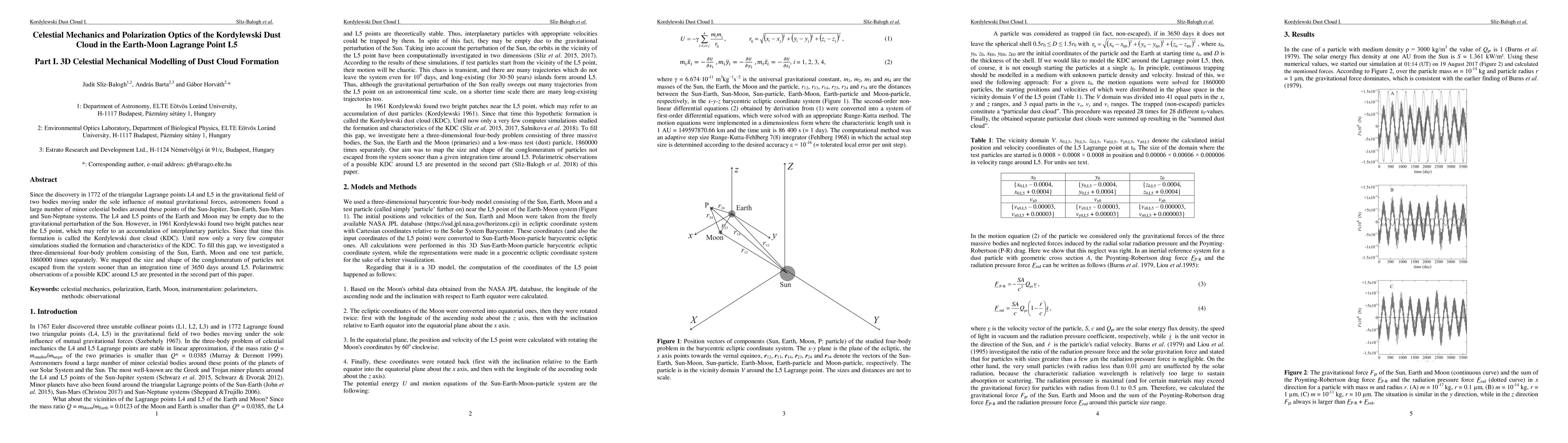 Since the discovery in 1772 of the triangular Lagrange points L4 and L5 in the gravitational field of two bodies moving under the sole influence of mutual gravitational forces, astronomers found a large number of minor celestial bodies around these points of the Sun-Jupiter, Sun-Earth, Sun-Mars and Sun-Neptune systems. The L4 and L5 points of the Earth and Moon may be empty due to the gravitational perturbation of the Sun. However, in 1961 Kordylewski found two bright patches near the L5 point, which may refer to an accumulation of interplanetary particles. Since that time this formation is called the Kordylewski dust cloud (KDC). Until now only a very few computer simulations studied the formation and characteristics of the KDC. To fill this gap, we investigated a three-dimensional four-body problem consisting of the Sun, Earth, Moon and one test particle, 1860000 times separately. We mapped the size and shape of the conglomeratum of particles not escaped from the system sooner than an integration time of 3650 days around L5. Polarimetric observations of a possible KDC around L5 are presented in the second part of this paper.