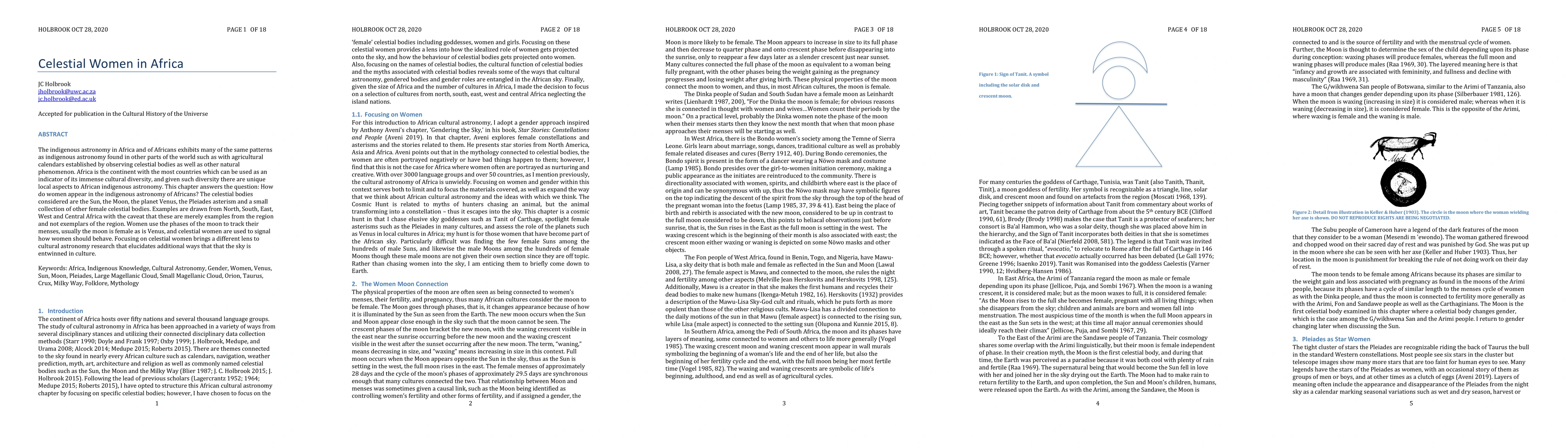 The indigenous astronomy in Africa and of Africans exhibits many of the same patterns as indigenous astronomy found in other parts of the world such as with agricultural calendars established by observing celestial bodies as well as other natural phenomenon. Africa is the continent with the most countries which can be used as an indicator of its immense cultural diversity, and given such diversity there are unique local aspects to African indigenous astronomy. This chapter answers the question: How do women appear in the indigenous astronomy of Africans? The celestial bodies considered are the Sun, the Moon, the planet Venus, the Pleiades asterism and a small collection of other female celestial bodies. Examples are drawn from North, South, East, West and Central Africa with the caveat that these are merely examples from the region and not exemplars of the region. Women use the phases of the moon to track their menses, usually the moon is female as is Venus, and celestial women are used to signal how women should behave. Focusing on celestial women brings a different lens to cultural astronomy research that elucidates additional ways that that the sky is entwined in culture.