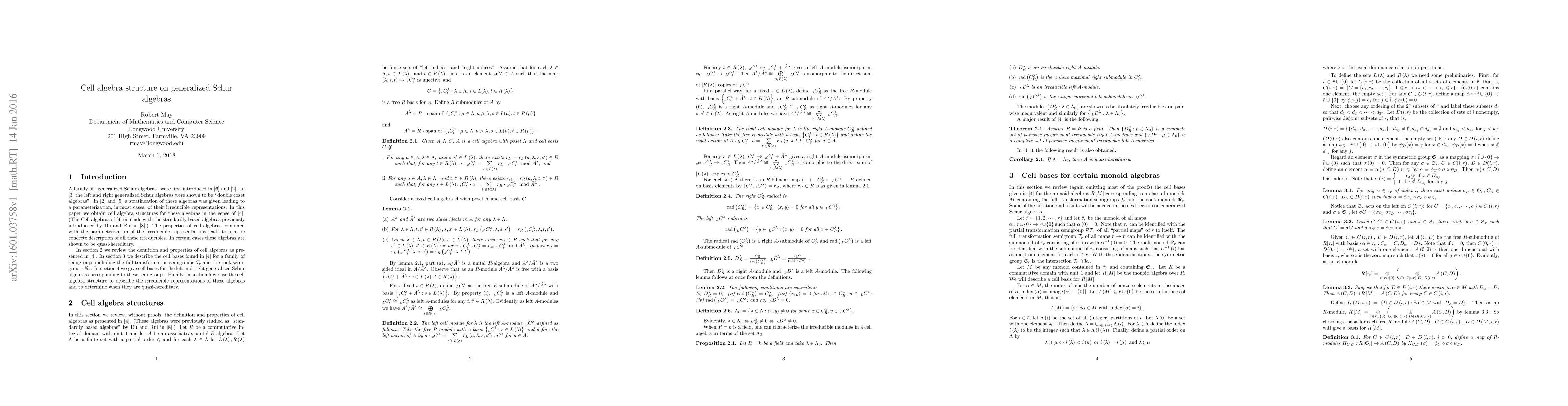 A cell algebra structure is found for generalized Schur algebras, allowing for the construction of irreducible representations and quasi-hereditary classification.