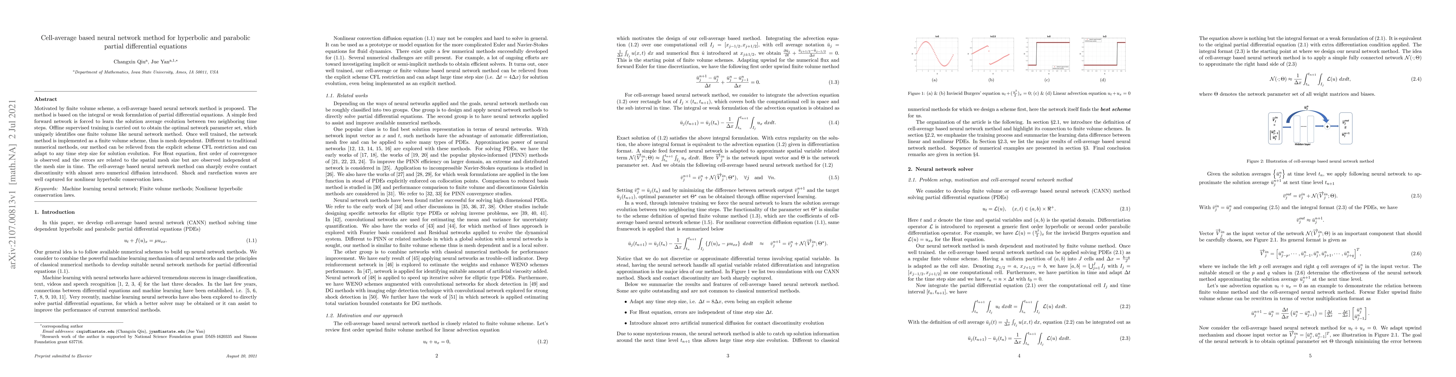 This paper proposes a cell-average based neural network method for solving hyperbolic and parabolic partial differential equations, inspired by finite volume schemes. The method demonstrates first-order convergence for the heat equation and effectively captures shock and rarefaction waves without significant numerical diffusion, while being free from the CFL restriction and adaptable to any time step size.
