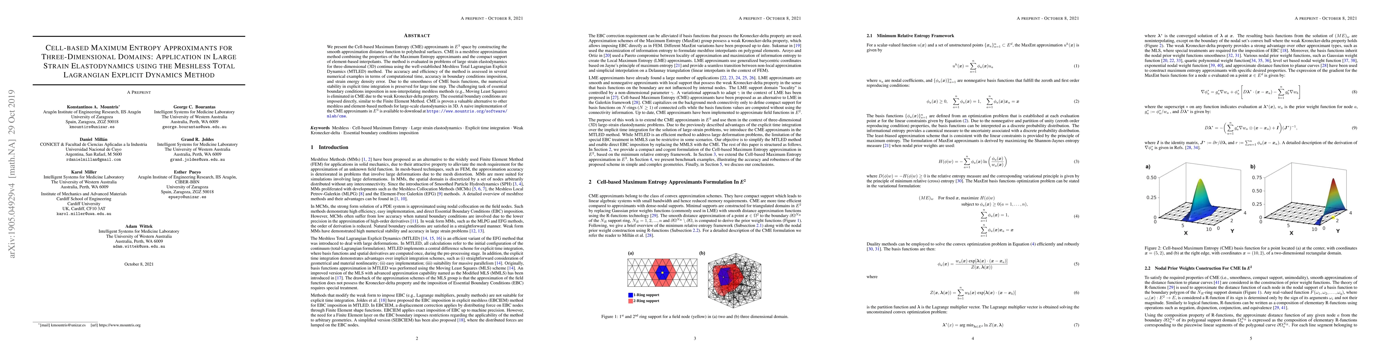 This paper introduces Cell-based Maximum Entropy (CME) approximants for three-dimensional domains, combining maximum entropy principles with compact support for meshfree approximation. The method is applied to large strain elastodynamics using the Meshless Total Lagrangian Explicit Dynamics (MTLED) method, demonstrating improved accuracy, efficiency, and numerical stability.