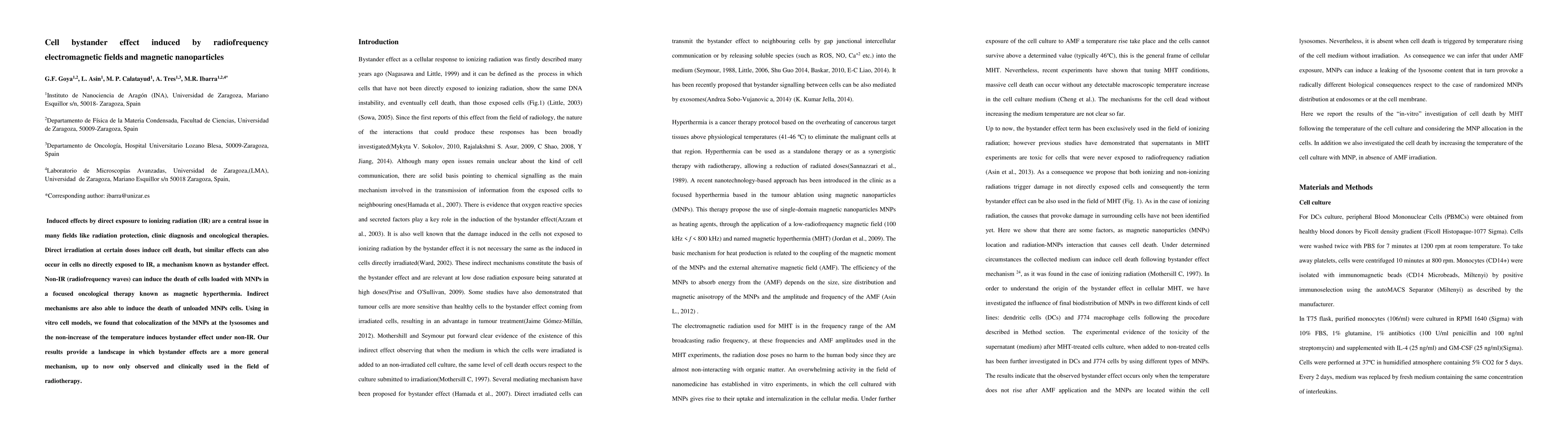 Summary: This study investigates the bystander effect induced by non-ionizing radiofrequency electromagnetic fields and magnetic nanoparticles (MNPs), revealing that cells not directly exposed to radiofrequency can still experience death due to MNPs' colocalization at lysosomes. These findings extend the understanding of bystander effects beyond ionizing radiation, with implications for magnetic hyperthermia therapies.