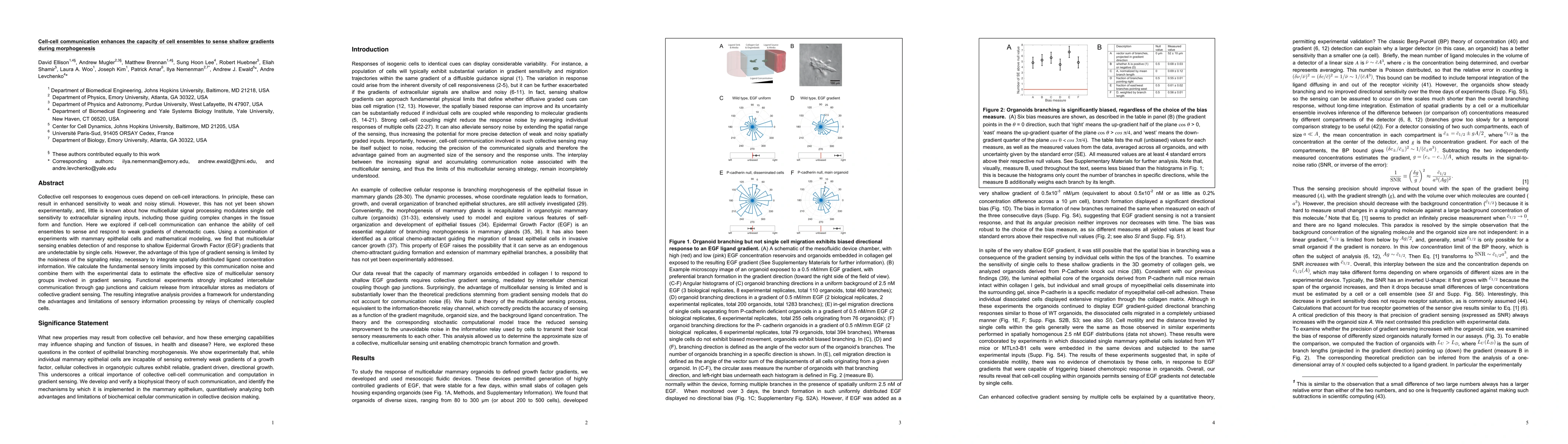 This paper demonstrates that cell-cell communication enhances the ability of cell ensembles to detect and respond to weak gradients of chemotactic cues, specifically shallow Epidermal Growth Factor (EGF) gradients. The study combines experiments with mammary epithelial cells and mathematical modeling to show that multicellular sensing overcomes the limitations of single-cell sensitivity, though it is constrained by communication noise.