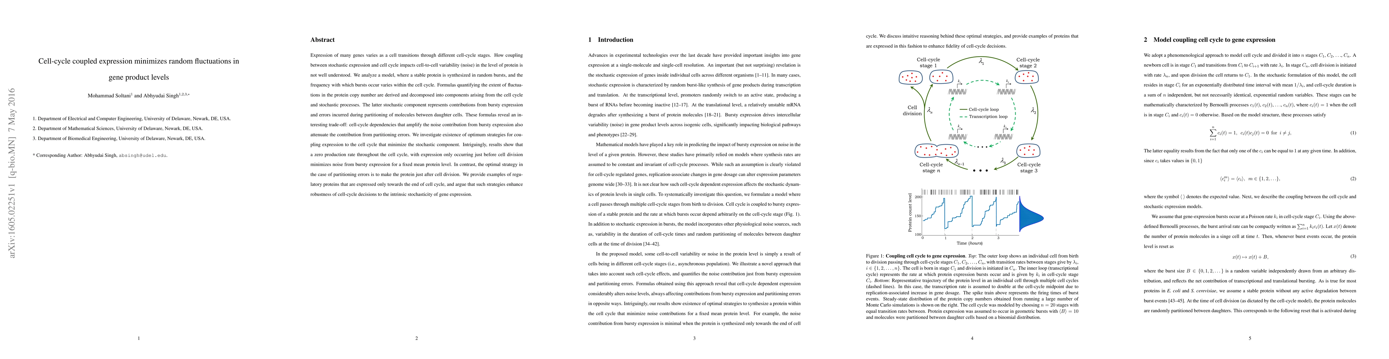 This paper explores how coupling gene expression to the cell cycle can minimize random fluctuations in protein levels, revealing a trade-off between noise from bursty expression and partitioning errors. It finds that optimal strategies involve minimal production before cell division to minimize noise, enhancing cellular robustness.