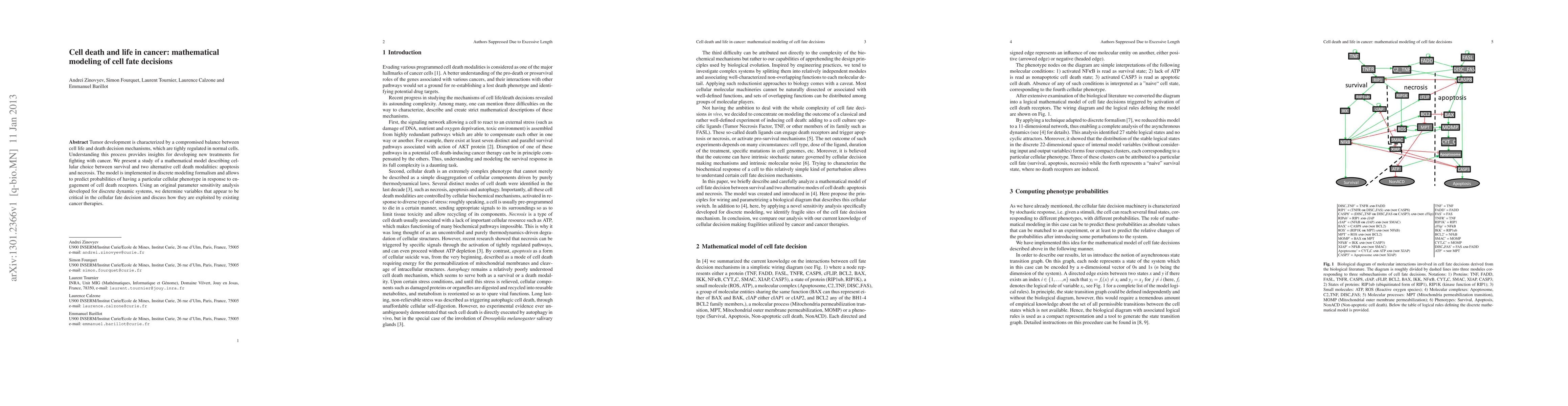 This paper develops a mathematical model to describe how cancer cells decide between survival and two types of cell death, apoptosis and necrosis. The model uses discrete formalism to predict cellular phenotypes and identifies critical parameters influencing these decisions, which can be targeted by cancer therapies.