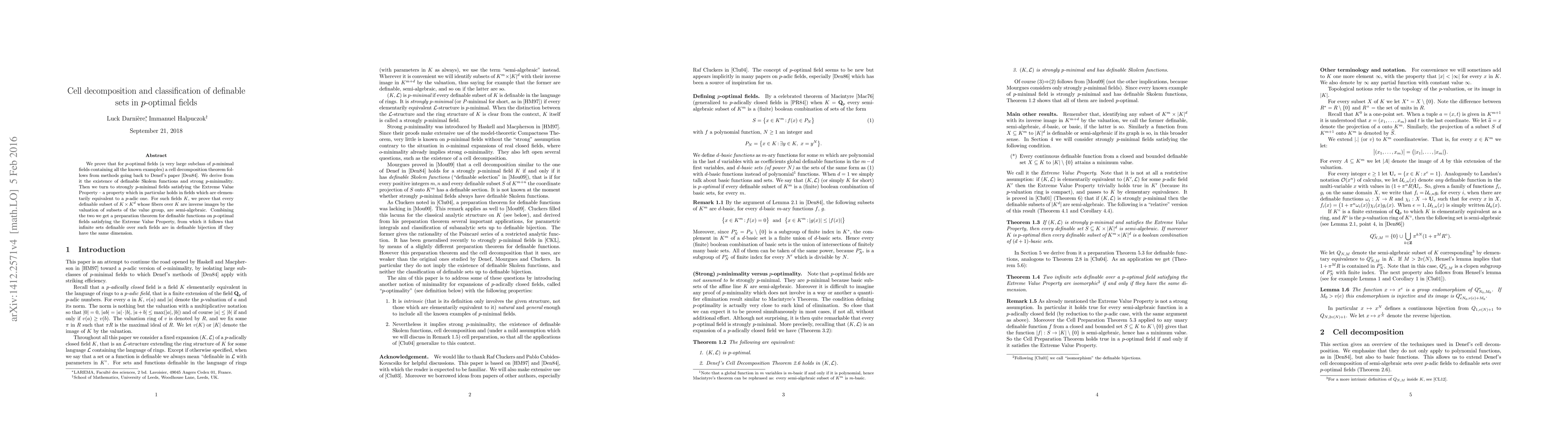 This paper proves a cell decomposition theorem for p-optimal fields, deriving definable Skolem functions and strong p-minimality. It also establishes semi-algebraicity for certain definable subsets in strongly p-optimal fields with the Extreme Value Property, leading to a preparation theorem and showing that definable infinite sets are isomorphic if they have the same dimension.