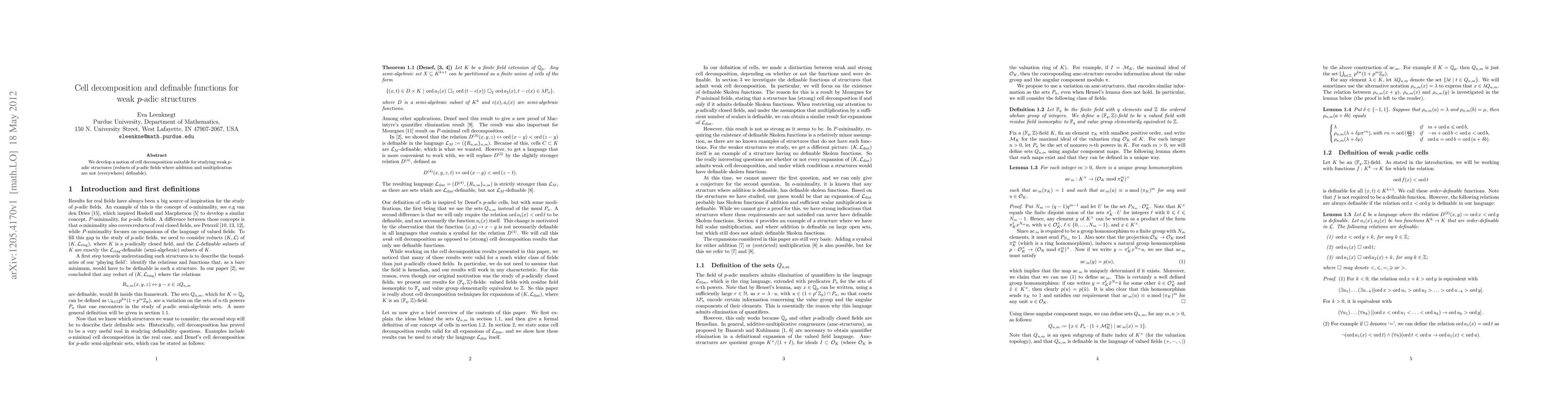 Summary: This paper introduces a cell decomposition method for analyzing weak p-adic structures, which lack full definable addition and multiplication, and demonstrates its application to a language with limited addition.