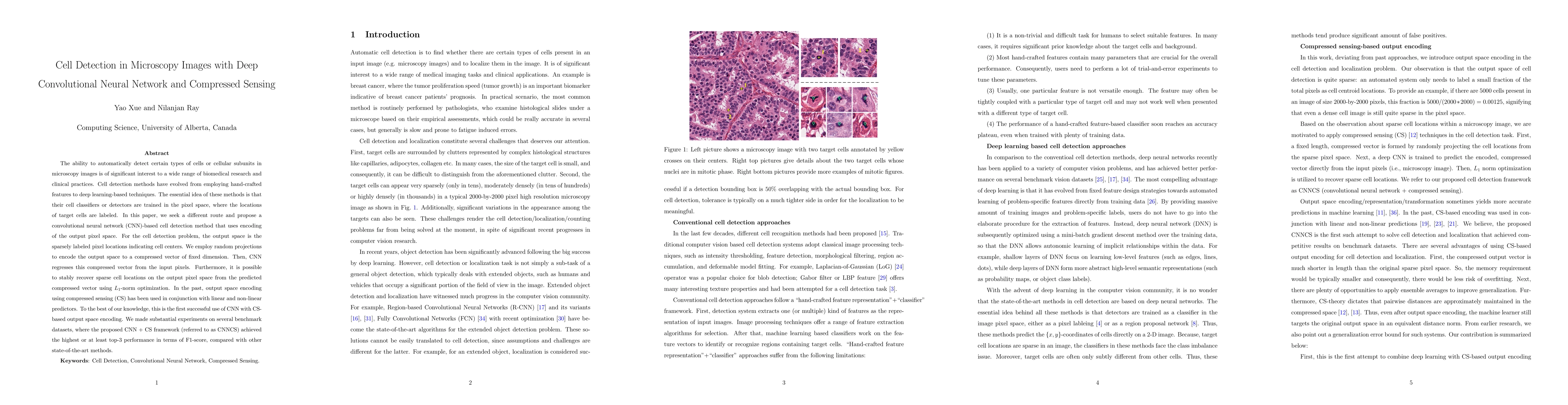 This paper proposes a novel convolutional neural network (CNN)-based method for cell detection in microscopy images, utilizing compressed sensing (CS) for output space encoding. The CNN regresses a compressed vector from input pixels, which is then used to recover sparse cell locations via $L_1$-norm optimization, achieving top performance on benchmark datasets.
