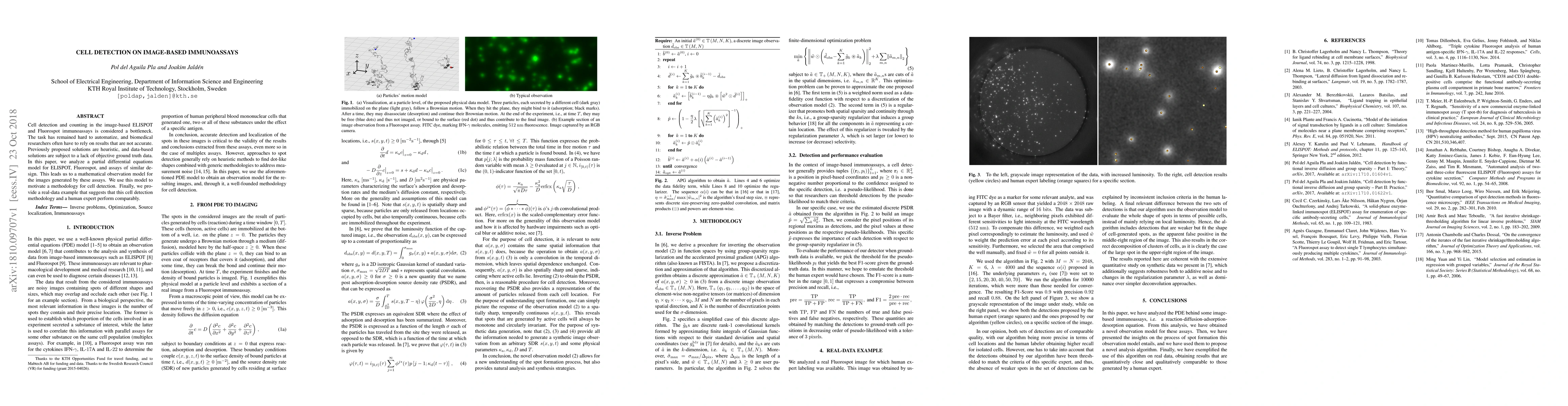 This paper proposes a mathematical observation model based on partial differential equations to improve cell detection in image-based immunoassays like ELISPOT and Fluorospot. The methodology is shown to perform comparably to human experts in a real-data example, addressing the challenge of inaccurate, heuristic-based detection methods.